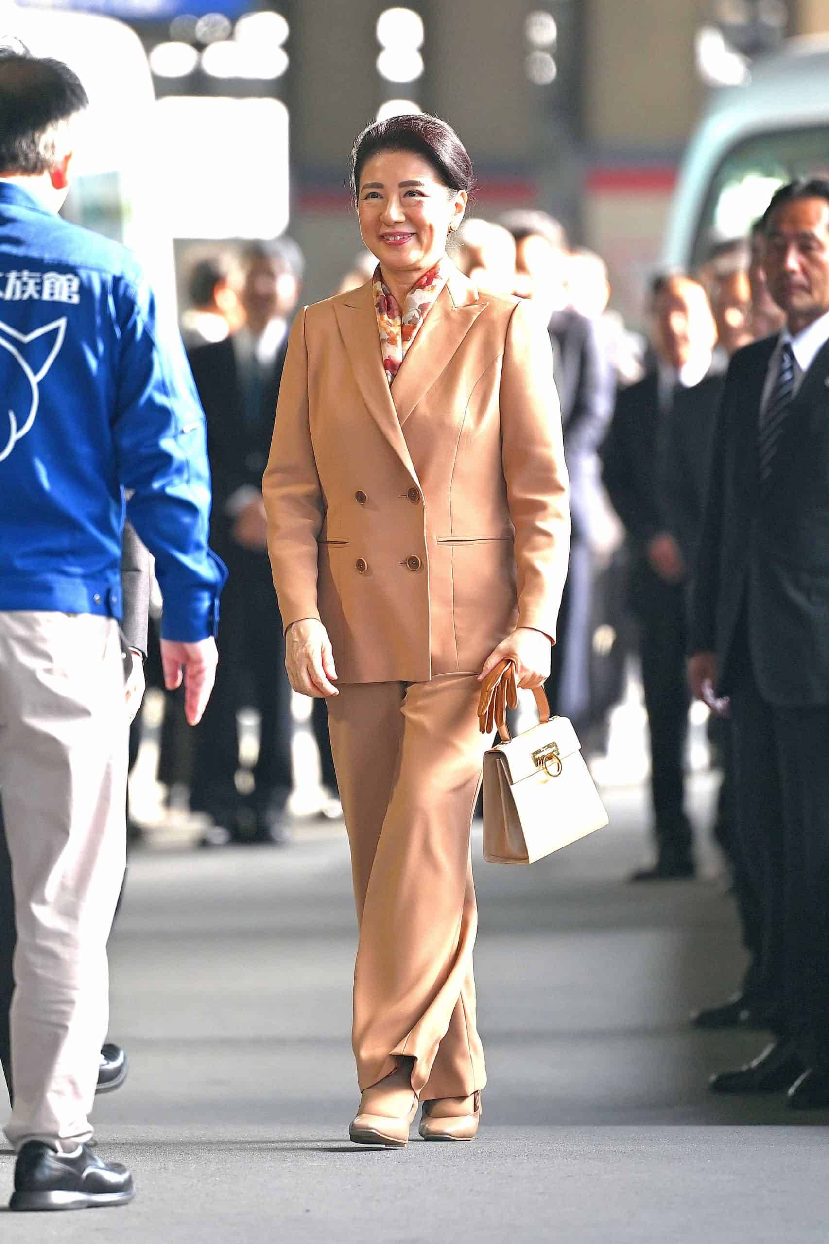 秋らしいシックなベージュのパンツスーツに、暖色の花柄のようなスカーフをほんのりと効かせた着こなし。シングルのジャケットが多い雅子さまには珍しいダブルのジャケットは、ハンサムに見えるアイテムですが、美しい紅葉を思わせるスカーフをプラスされることで麗しいムードが高まる印象です。1つ前の着こなしではフェラガモとお見受けするスカーフを着用されていましたが、この着こなしでお持ちになっているバッグもフェラガモのミニケリー。ご成婚前から大切に使われているそう。雅子さまの物を大切にされるお人柄が感じられます。