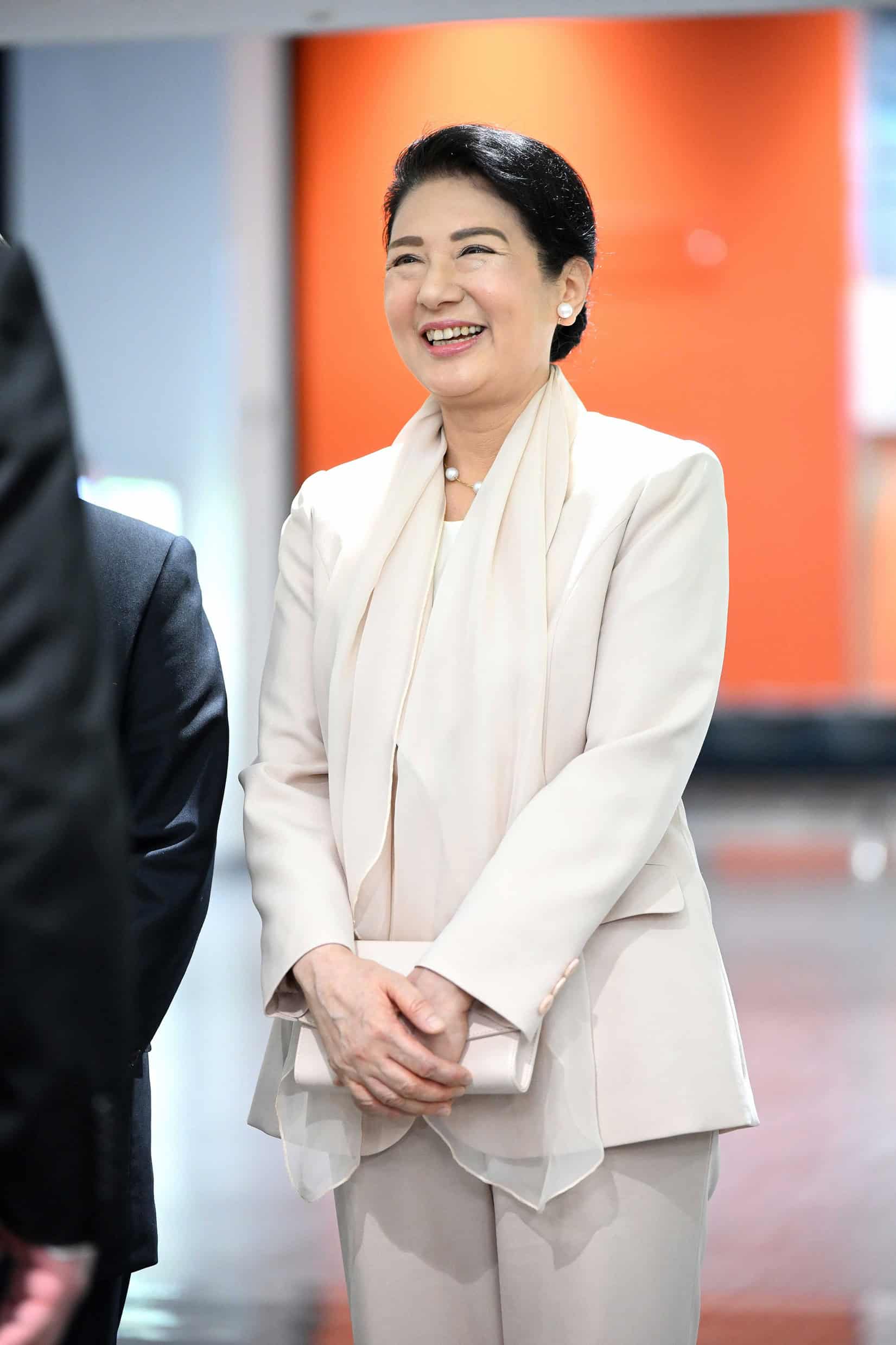 雅子さまのご公務の定番、マニッシュなテーラードジャケットのパンツスーツに華やかな印象を添える同系色のスカーフを。ショールのように纏うことで、柔らかく透け感のある素材の上質さが際立ち、雅子さまの優美な雰囲気と響き合っています。また、素材感で朗らかな春の日差しのような軽やかさも体現されているようにも感じます。この日はアクセントカラーは使わず、ジュエリーもパール、クラッチバッグもオフホワイトと、クリーンなカラーコーディネートでまとめられた雅子さま。万博の開会式当日でもあったので、まだ何色にも染まっていない「白」を選ばれたのかもしれません。