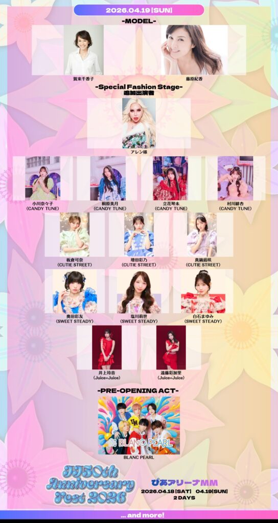 さらに、出演アーティストからもファッションステージへの出演が決定!CANDY TUNEから立花琴未、小川奈々子、村川緋杏、桐原美月、SWEET STEADYから白石まゆみ、塩川莉世、奥田彩友、CUTIE STREETから真鍋凪咲、板倉可奈、増田彩乃、Juice=Juiceから井上玲音、遠藤彩加里が参加します。ライブパフォーマンスだけでなく、ここでしか見られないステージは必見です!