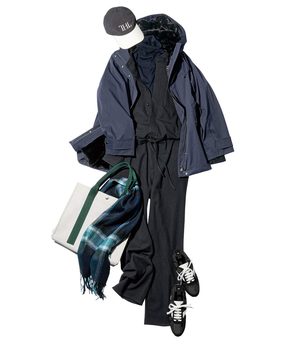 マウンテンパーカ¥25,000(PLST)ニット¥34,100(スローン/ザ ショップ スローン 新静岡セノバ店)オールインワン¥49,500(ニコラ ジェンソン/リノウン)キャップ¥18,700(ザハイライツ)マフラー¥17,600 (ルーニィ)バッグ¥33,000(フランソワ レニエ/ヤマニ)スニーカー¥12,900(チャールズ&キース/チャールズ&キース ジャパン)