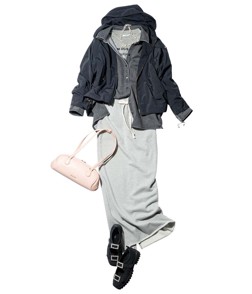 撥水ブルゾン¥36,300(ルーニィ)デニムシャツ¥14,000(PLST) Tシャツ¥17,600(フィーニー)スカート¥27,500(サクラ/インターリブ)バッグ¥12,900(チャールズ&キース/チャールズ&キース ジャパン)シューズ¥38,500(ツル バイ マリコ オイカワ)ネックレス¥31,860バングル¥4,620(ともにアビステ)