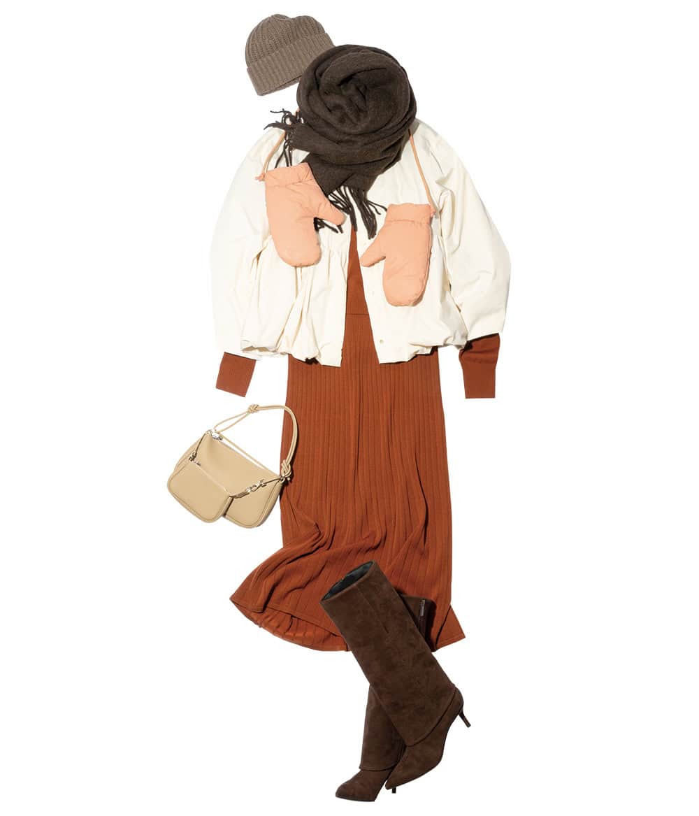 コート¥36,300(CELFORD/CELFORD ルミネ新宿2店)ワンピース¥66,000(ティーチ)バッグ¥33,000ミニバッグ¥16,500(ともにヴァジック/ヴァジックジャパン)ブーツ¥16,900(チャールズ&キース/チャールズ&キース ジャパン)ニット帽¥7,000ストール¥24,000(ともにバナナ・リパブリック)ミトングローブ¥18,700(ミフュー)