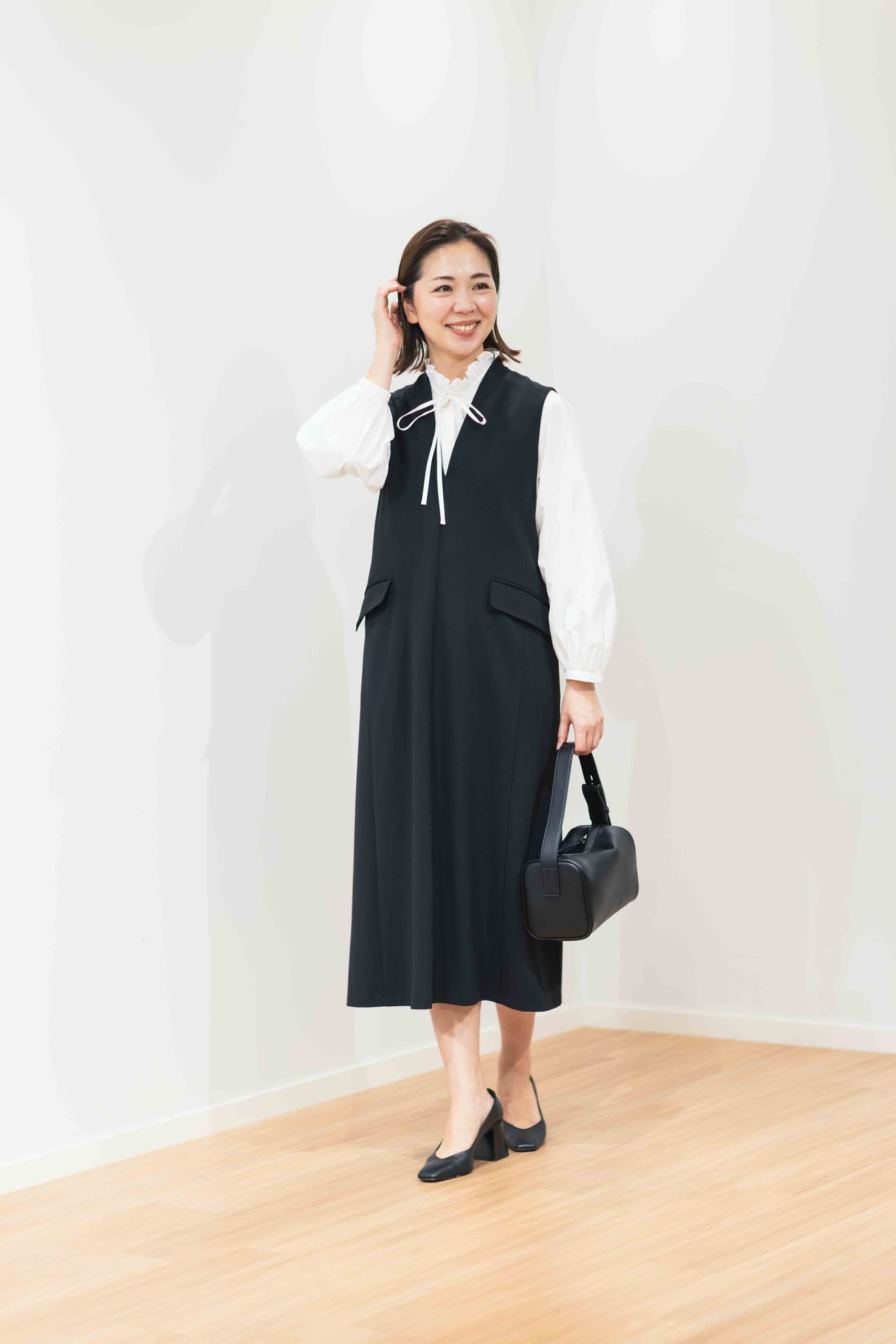 ジョーゼットジャージージャンパーワンピース¥15,000 タイプライターフリルブラウス¥9,990パールバーイヤリング¥2,990(すべてプラステ)※バッグは参考商品※ワンピース、ブラウスはともにMサイズを着用 靴(私物)