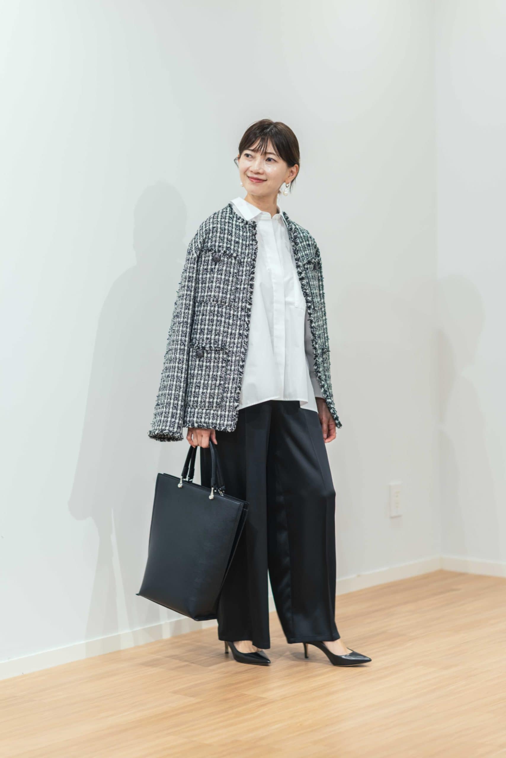 ツイードジャケット¥30,000 サテンイージーパンツ¥7,990 タイプライタードルマンシャツ¥9,990 2WAYトートバッグ¥9,990(すべてプラステ)※すべてMサイズを着用 靴(私物)