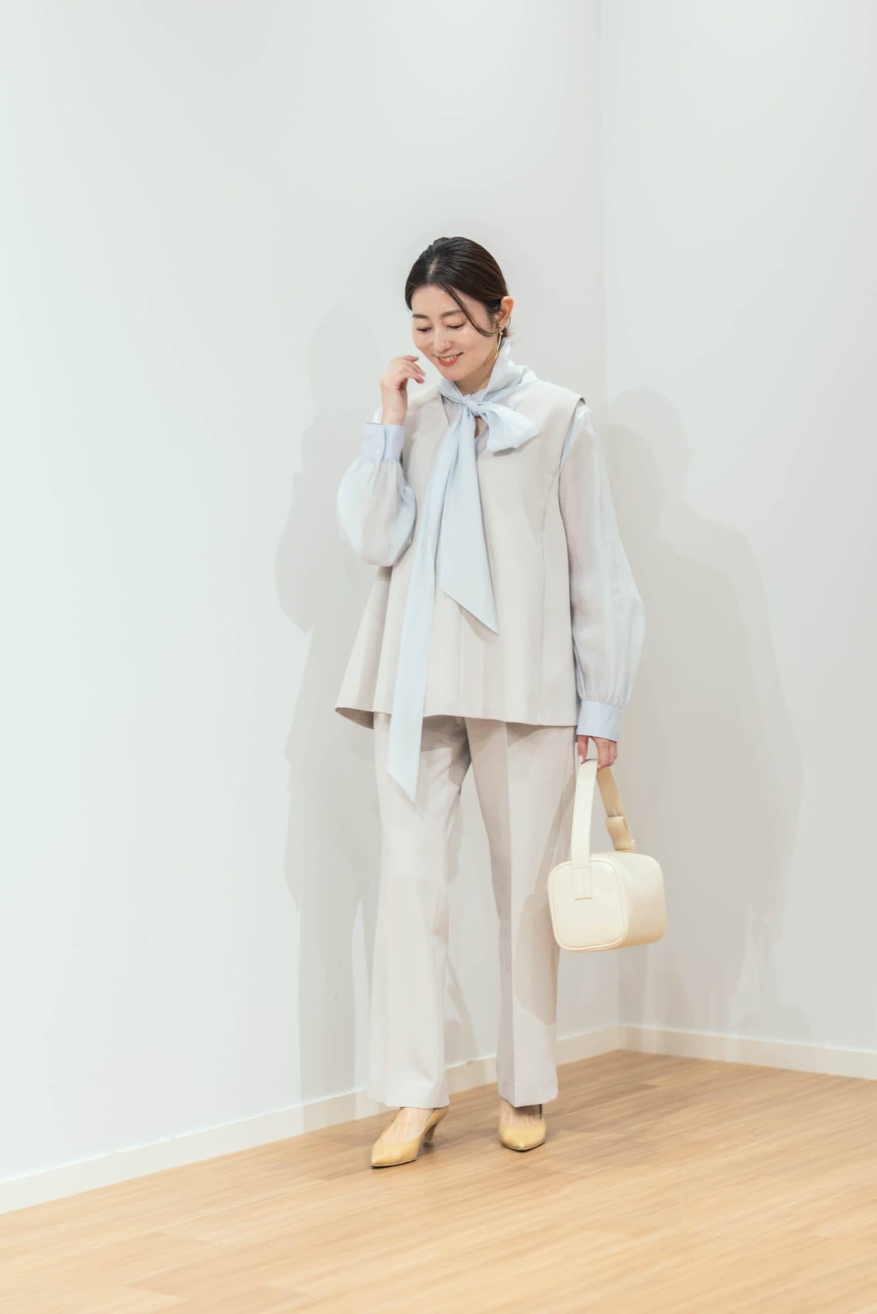 ダブルクロステントラインジレセットアップ¥15,000 シアーボウタイブラウス¥8,990 パールバーイヤリング¥2,990 (すべてプラステ)※バッグは参考商品※セットアップ、ブラウスはともにMサイズを着用 靴(私物)