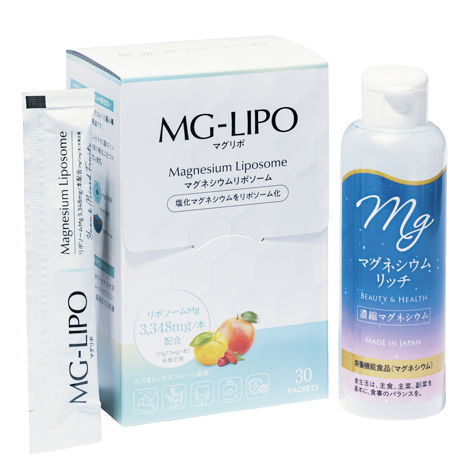 マグネシウムは神経伝達に関与し、体を緩めて副交感神経を優位にさせる重要な栄養素。体内では生成されないので、食事で補えない分は経口摂取で吸収力もアップ。左:ナチュラル成分100%の液状リポソーム化マグネシウム。マグリポ 10g×30本入り ¥8,610(オーガニックサイエンス) 右:高知県室戸沖の海洋深層水が原料。小さじ2杯分を飲み物に混ぜて。マグネシウムリッチ 150ml ¥1,188(赤穂化成)