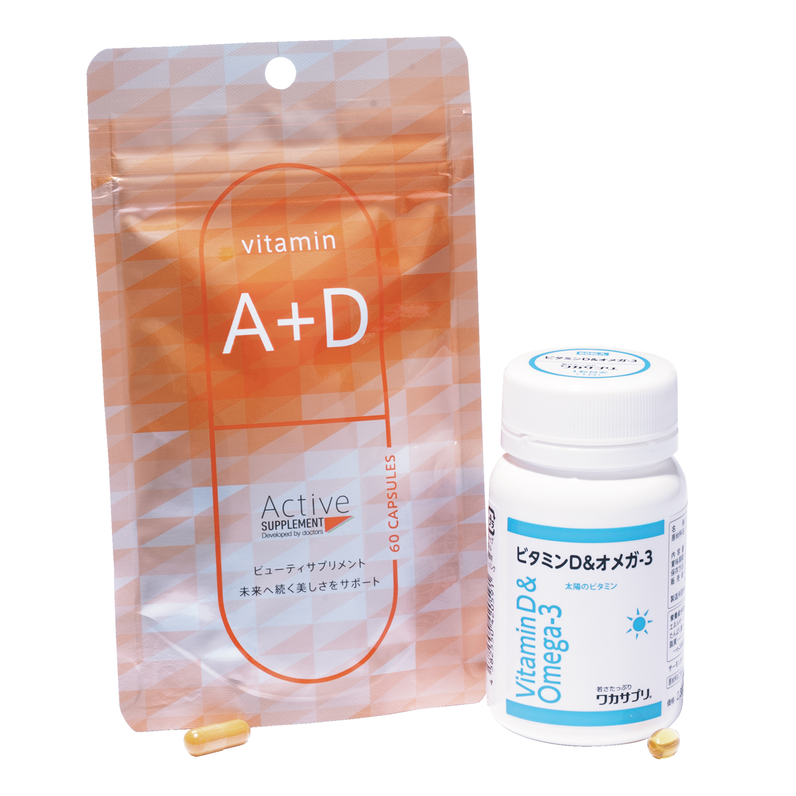 骨の形成を助ける働きや免疫力の向上にも注目されるビタミンDは、更年期対策に重要なセロトニンを生成する際にも必要。左:美肌効果の高さで知られ、脳機能の調整にも影響を与えるビタミンAも高配合。アクティブサプリ ビタミンA+D 60粒 ¥3,996(プロティア・ジャパン) 右:オメガ3脂肪酸も血液サラサラ効果だけでなく不安感の軽減をサポート。ワカサプリⓇ ビタミンD&オメガ-3 60粒 ¥2,484(分子生理化学研究所