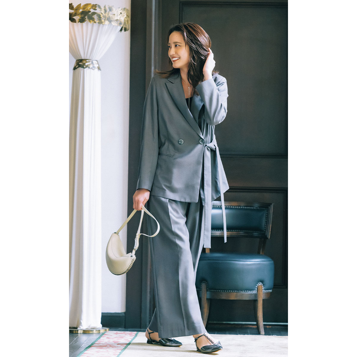 やわらかなグレーのセットアップに寄り添うのは、曲線が美しいハーフムーン型のミニバッグ。丸みのあるフォルムが女性らしさをふわっと引き寄せつつ、淡いトーンがスタイリングに自然となじみます。シックな色を選びがちなお呼ばれコーデに、新鮮なムードを添えてくれるはず。