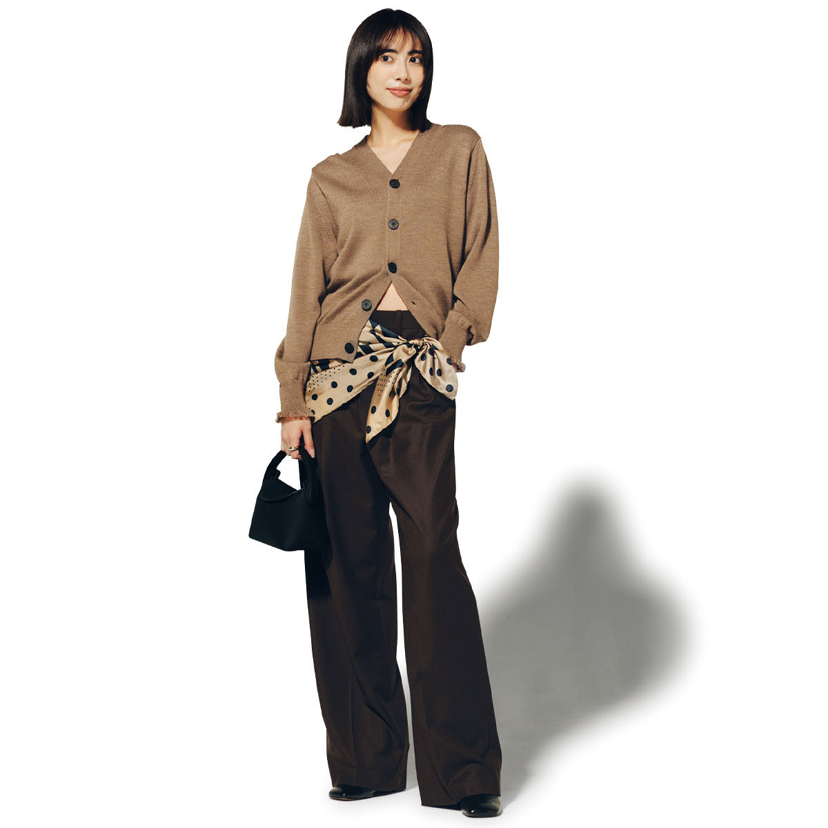 ゆったりしたカーデ×ワイドパンツのリラックスコーデには、コンパクトな黒のミニバッグを選び印象をキュッと引き締めて。腰まわりに巻いたドット柄スカーフが遊び心を添えつつ、バッグのミニマルさが全体の重さを回避してくれます。ニュアンスブラウンのワントーンも、小物でメリハリをつければ一気にスタイリッシュ。