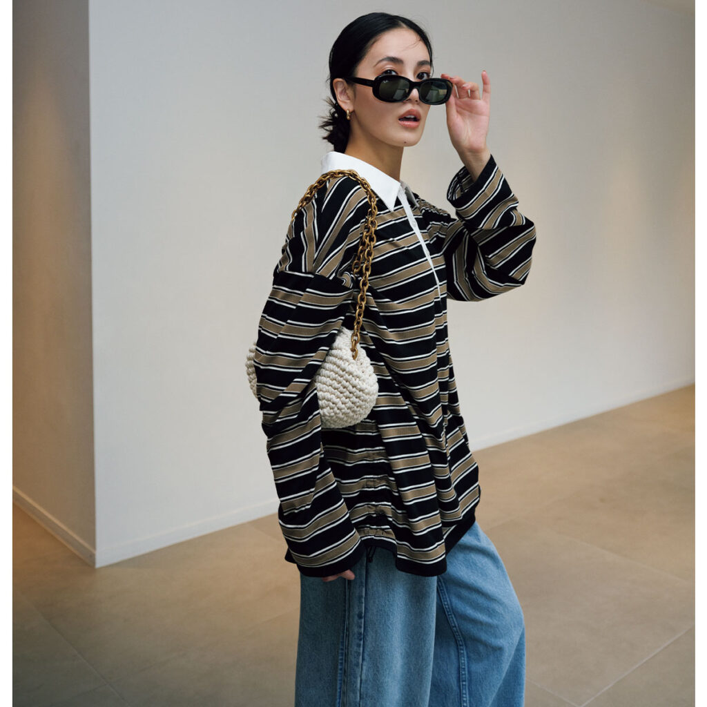 ボリュームのあるラガーシャツとワイドデニムのラフな組合せには、存在感のあるミニバッグがちょうどいいスパイス。ころんとした編みボディにチェーンストラップを効かせたバッグなら、カジュアルの中にひと粒の華やぎが宿ります。小ぶりだからこそ重たくならず、肩掛けするだけでコーデが洗練されるのも魅力。