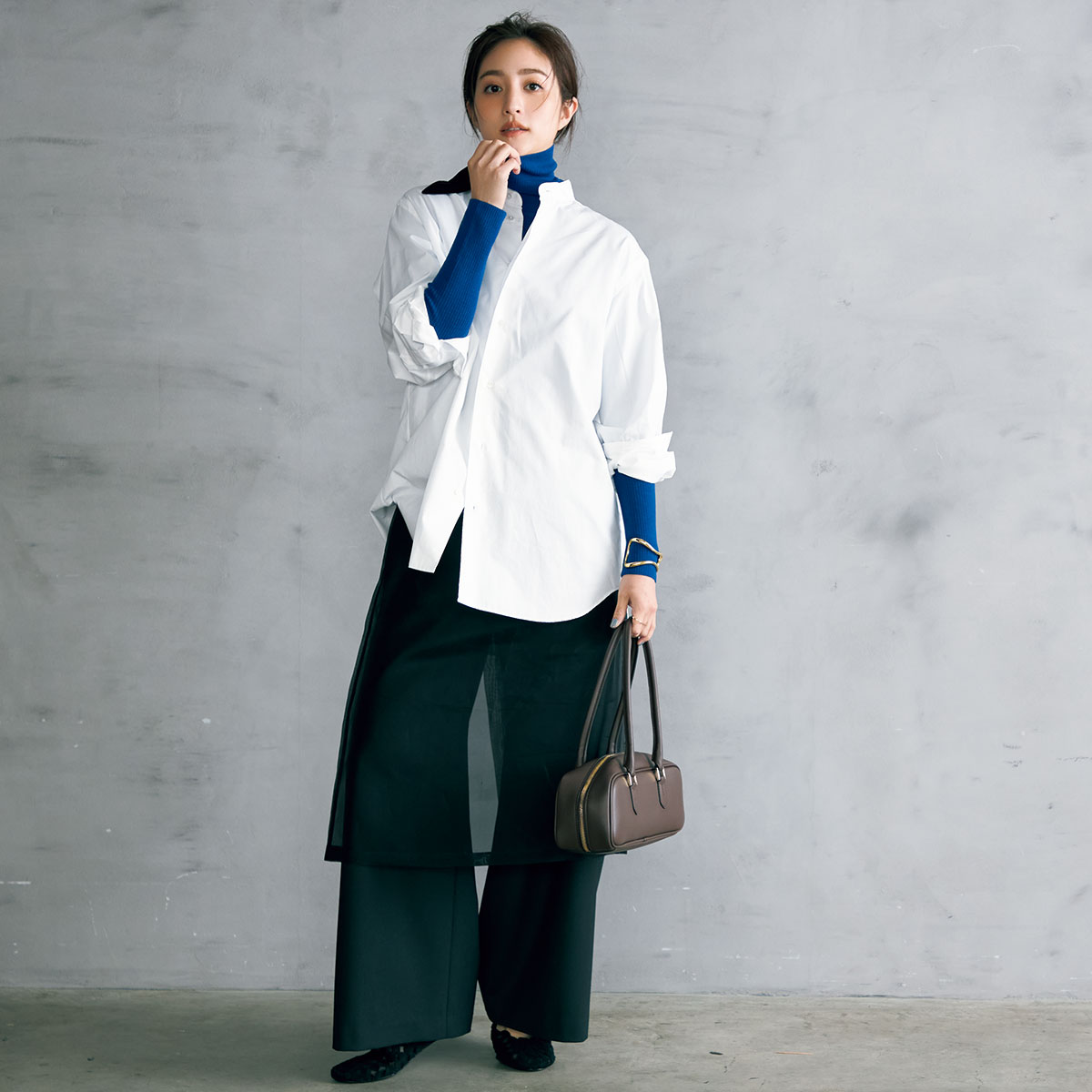 ブルータートルのアクセントが効いたレイヤードに、深みのあるブラウンのミニバッグが温度を添える絶妙バランス。明るい白シャツとも黒のレイヤードボトムとも自然になじんで、大人っぽいまとまりが生まれます。横長フォルムが引き算になり、全体がスマートに見えるのも嬉しいポイント。