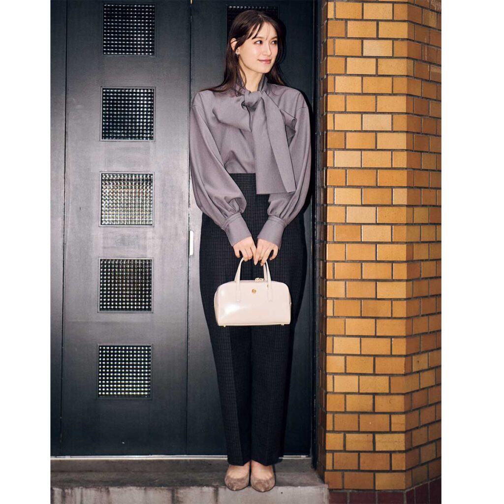 淡いトーンのミニバッグが、シックな装いに上品な明るさをプラス。ボウタイブラウスのエレガントなディテールと、パンツの端正なラインをうまくつなぎ、全体を柔らかなムードへと引き寄せてくれます。重く見えがちなカラーレスコーデを軽やかに仕上げたい日にぴったりの組み合わせ。