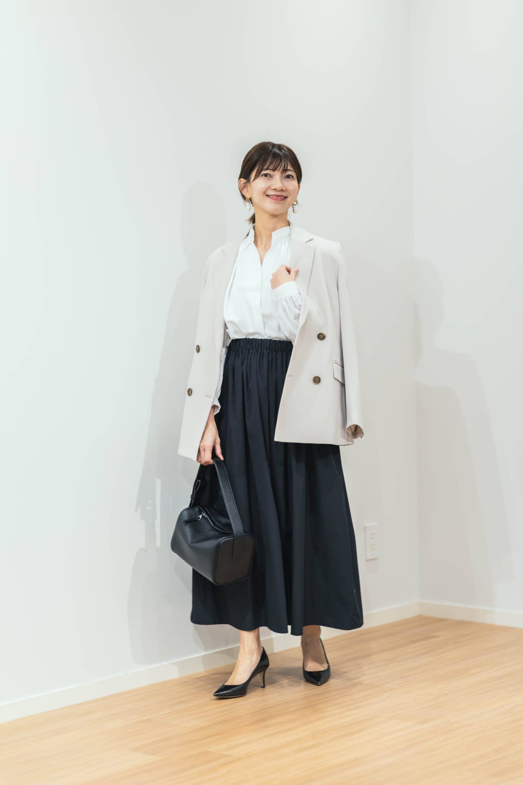 「ハリ感のあるロングフレアスカートに、明るめのベージュジャケットを合わせたコーデ。インナーには、柔らかくほんのり光沢のあるブラウスをセレクト。きちんと感と品の良さを感じる印象に仕上げました。こちらのスカートは長時間座ってもシワが気になりにくく、ラクな着心地なところも嬉しいポイントです。」