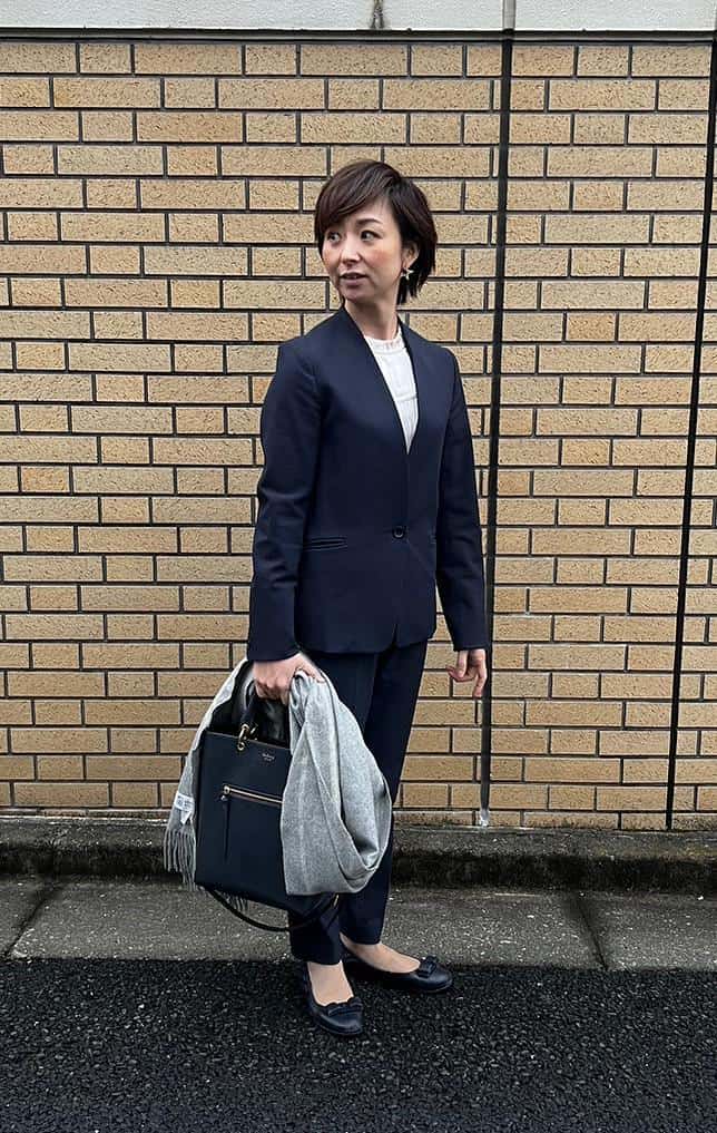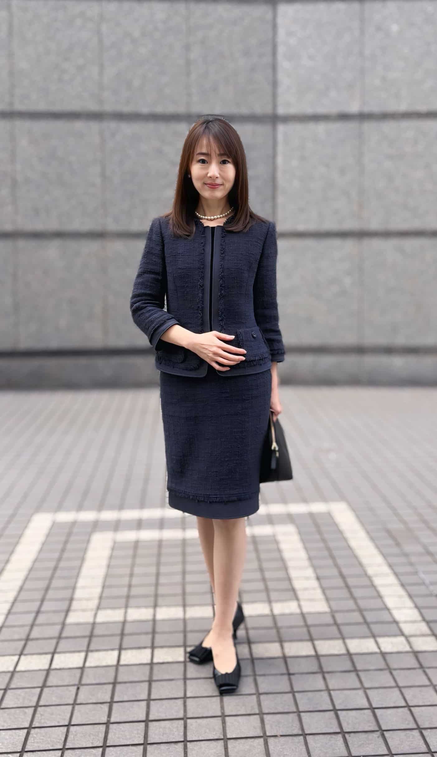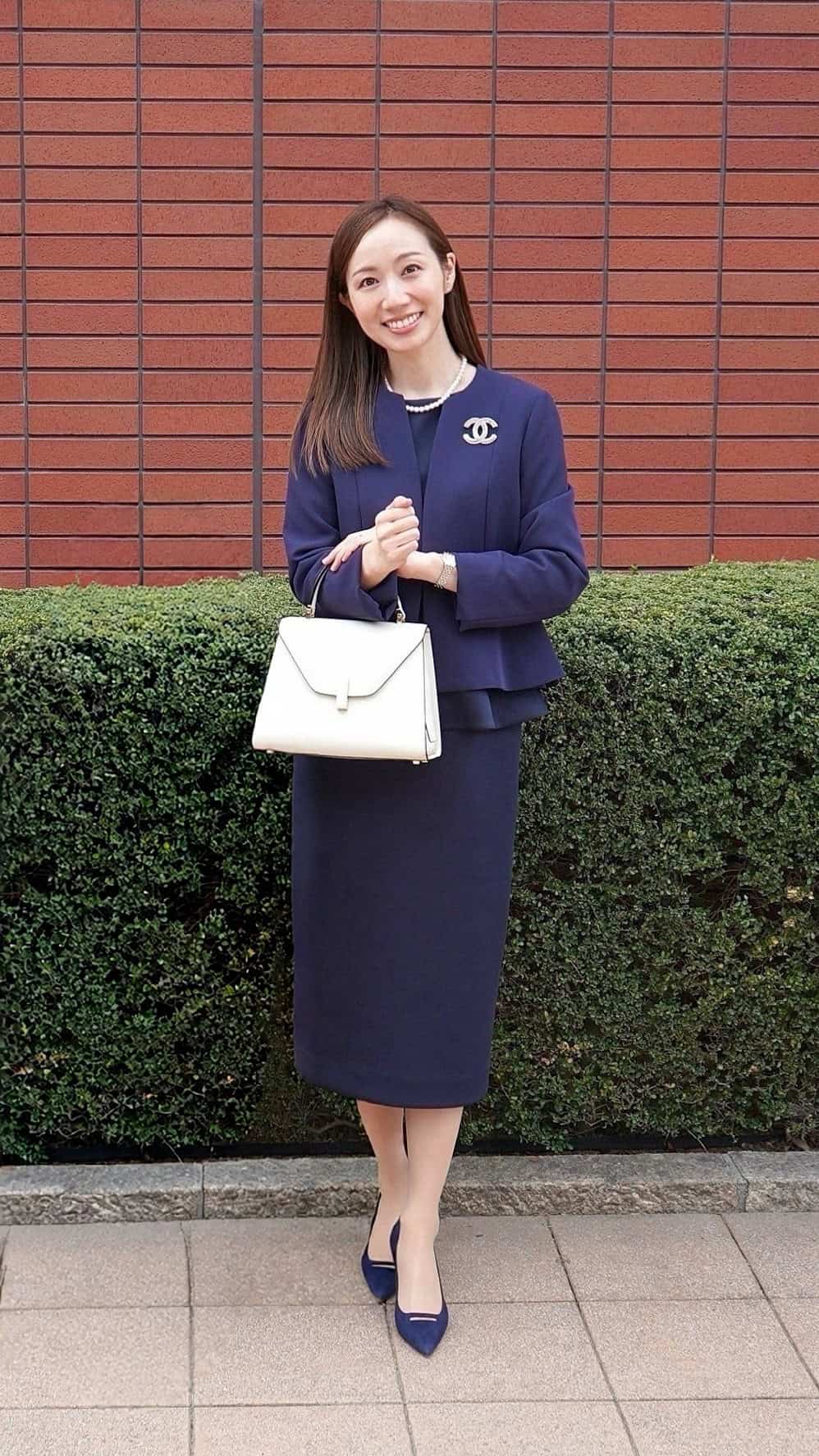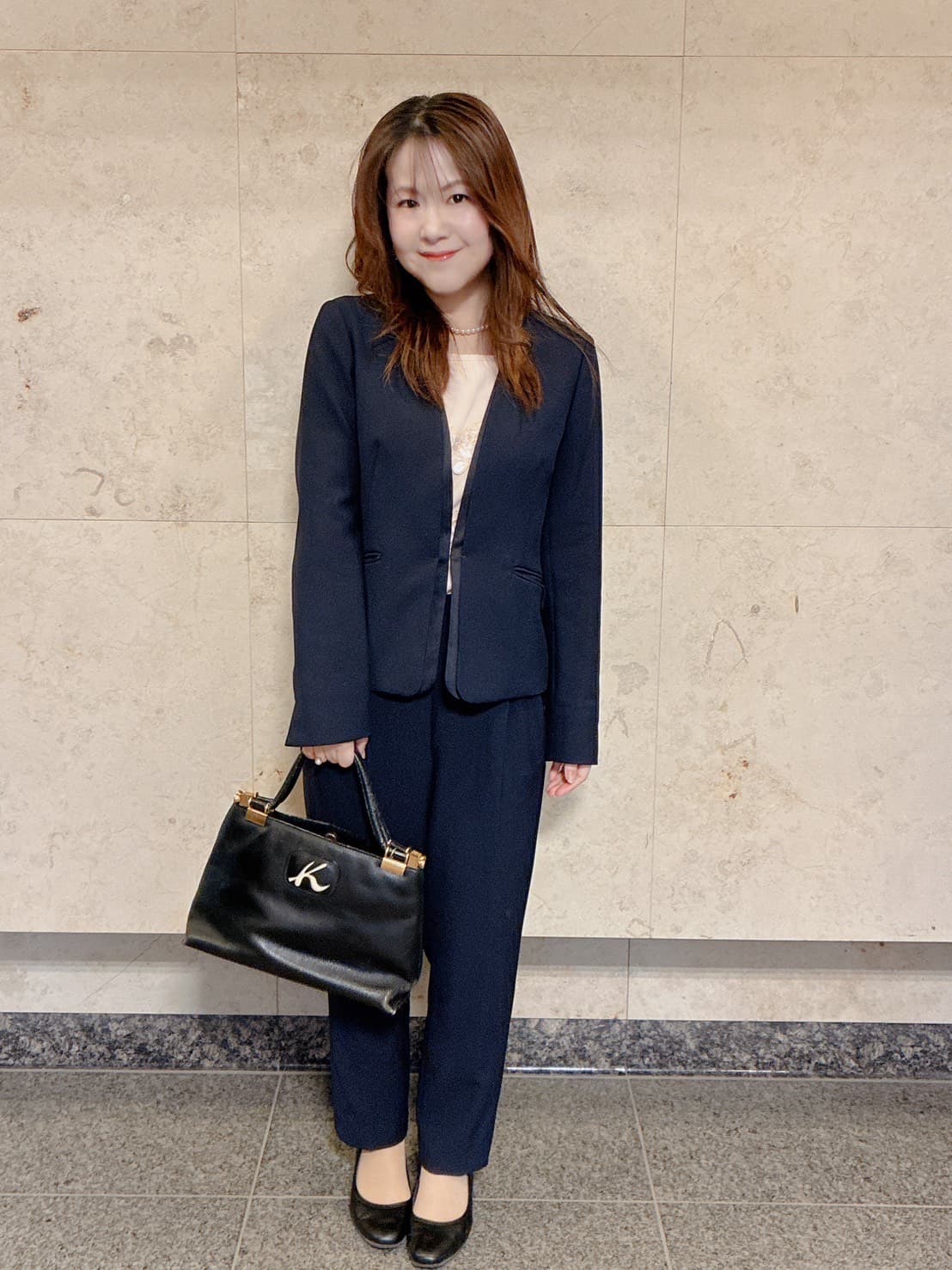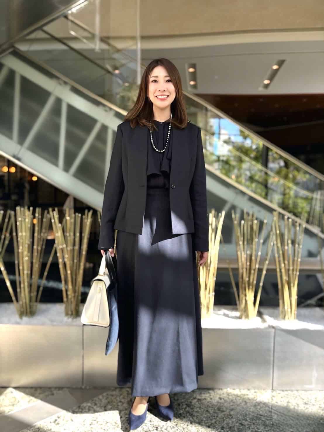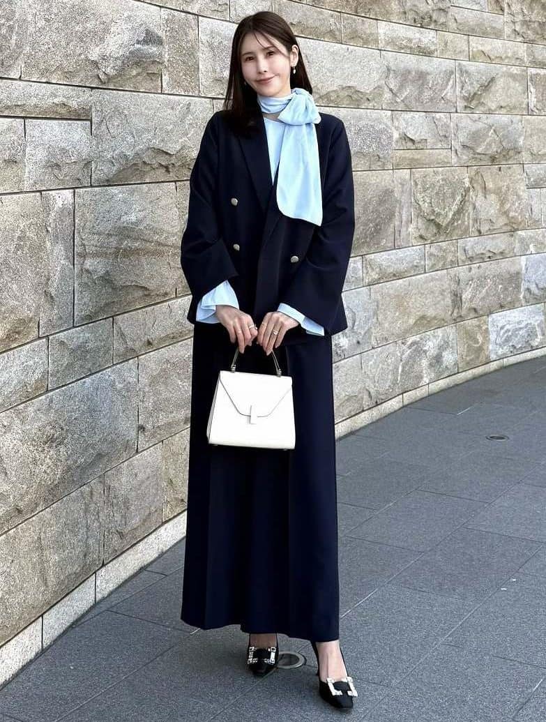 卒業式なので落ち着いたネイビーをベースにしつつ、リボンブラウスでほどよい華やかさをプラスしました。きちんと見えるのにかたくなりすぎない、抜け感のあるバランスを意識しています。特別な日だからこそ、自然体で上品に見えるコーデを選びました。