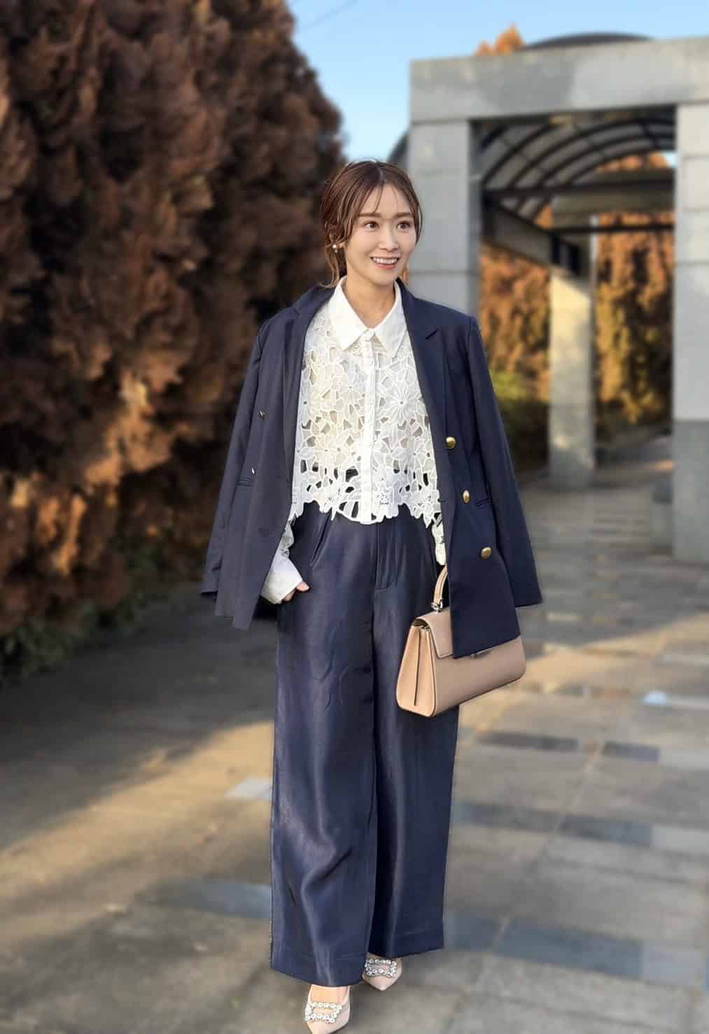 卒業式にはきちんと感のあるネイビー×ホワイトコーデに。光沢感や花レースで写真映えする華やかさもプラス。式典では品よく、記念写真ではさりげなく映えるのがポイントです。セットアップではなく素材やディテールを自分好みに組み合わせてオンリーワンの装いに。ヘアはゆるっとアップ、小物はベージュでまとめて、柔らかな印象に仕上げています。