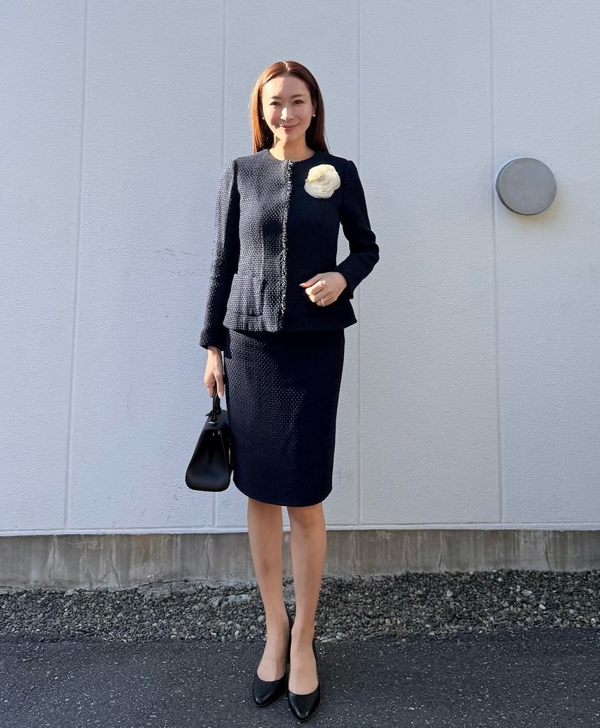 王道のきれいめスーツを選び、コンサバにまとめました。奇をてらわず、きちんと感を大切にした安心感のある装いに。セレモニーらしい品格を意識したベーシックなスタイルです。コサージュは母から受け継いだもので、式典のたびに胸元をぱっと華やかにしてくれる大切な存在です。