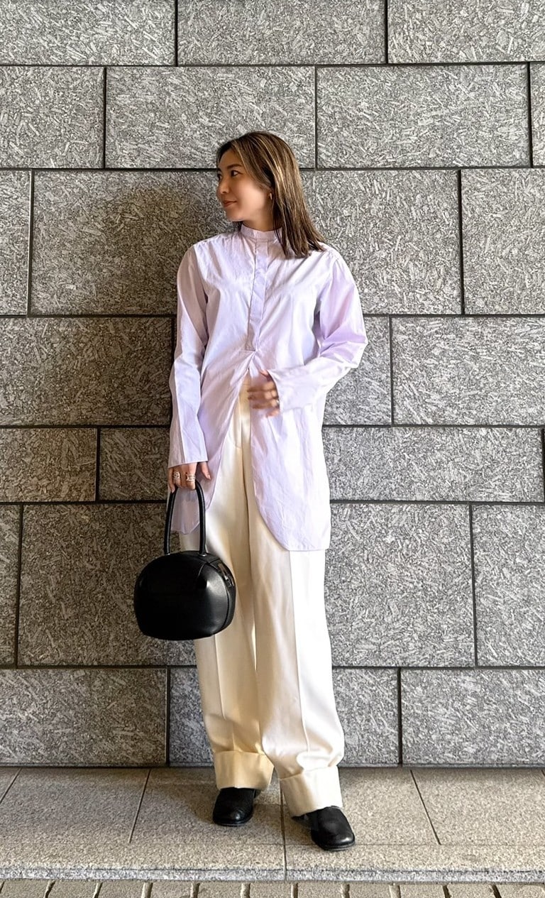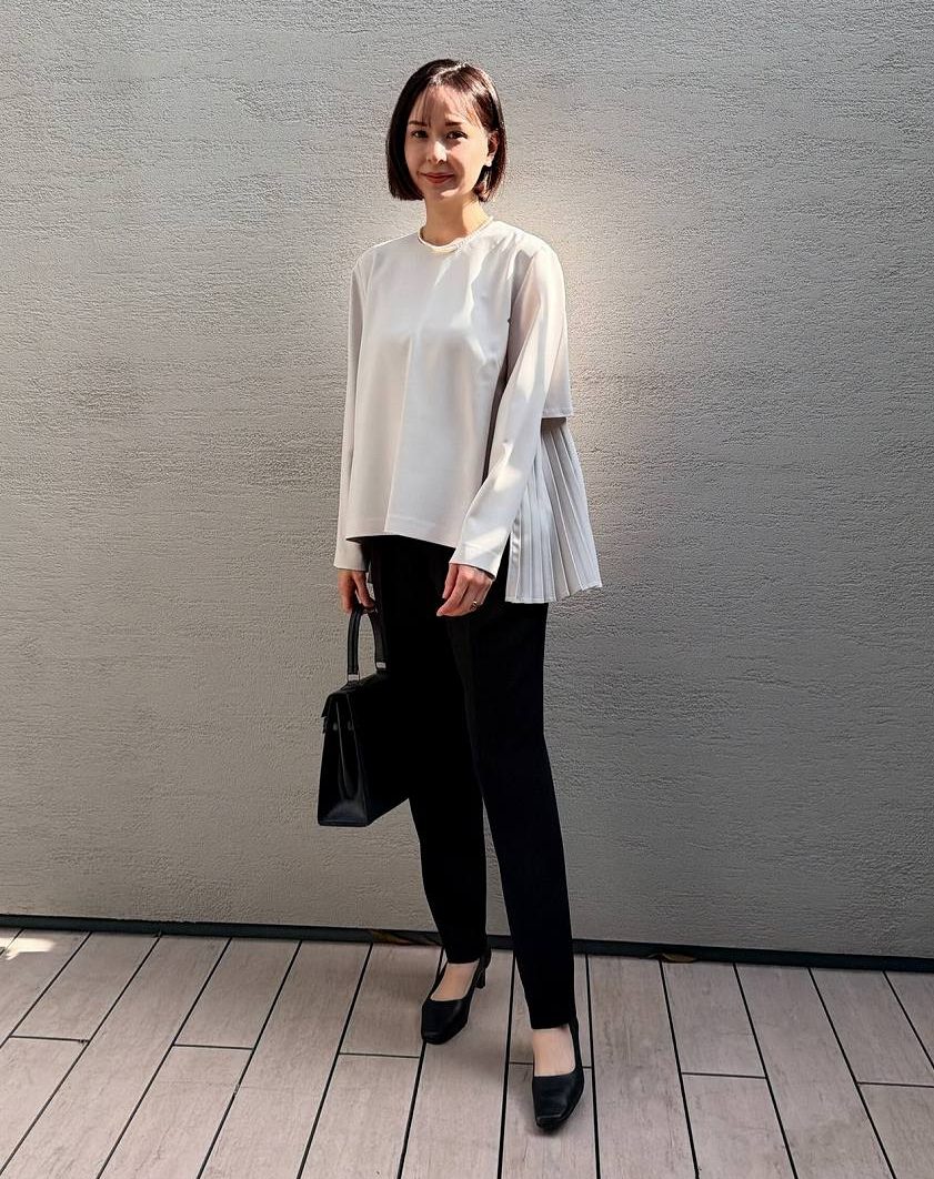 公立中学校の入学式だったので、少しカジュアルでも浮かず、むしろ黒やネイビー、グレーの服の方が多い中、ラベンダーと白が「春らしい」と褒められました。シューズとバッグはコーデの引き締め役としてブラックで統一。式典用にはあえて準備せず、普段使いのアイテムを少しフォーマルに寄せました。