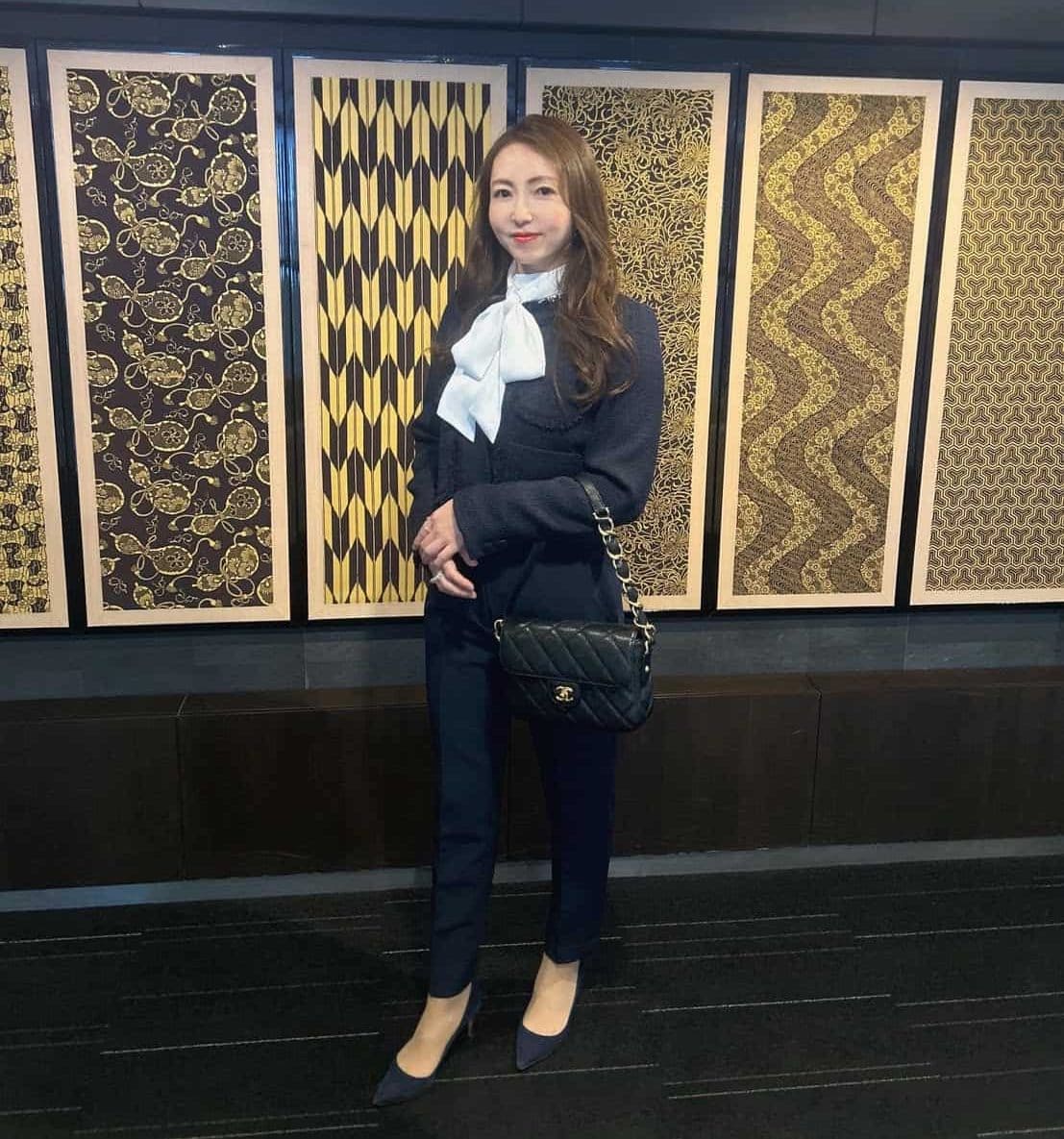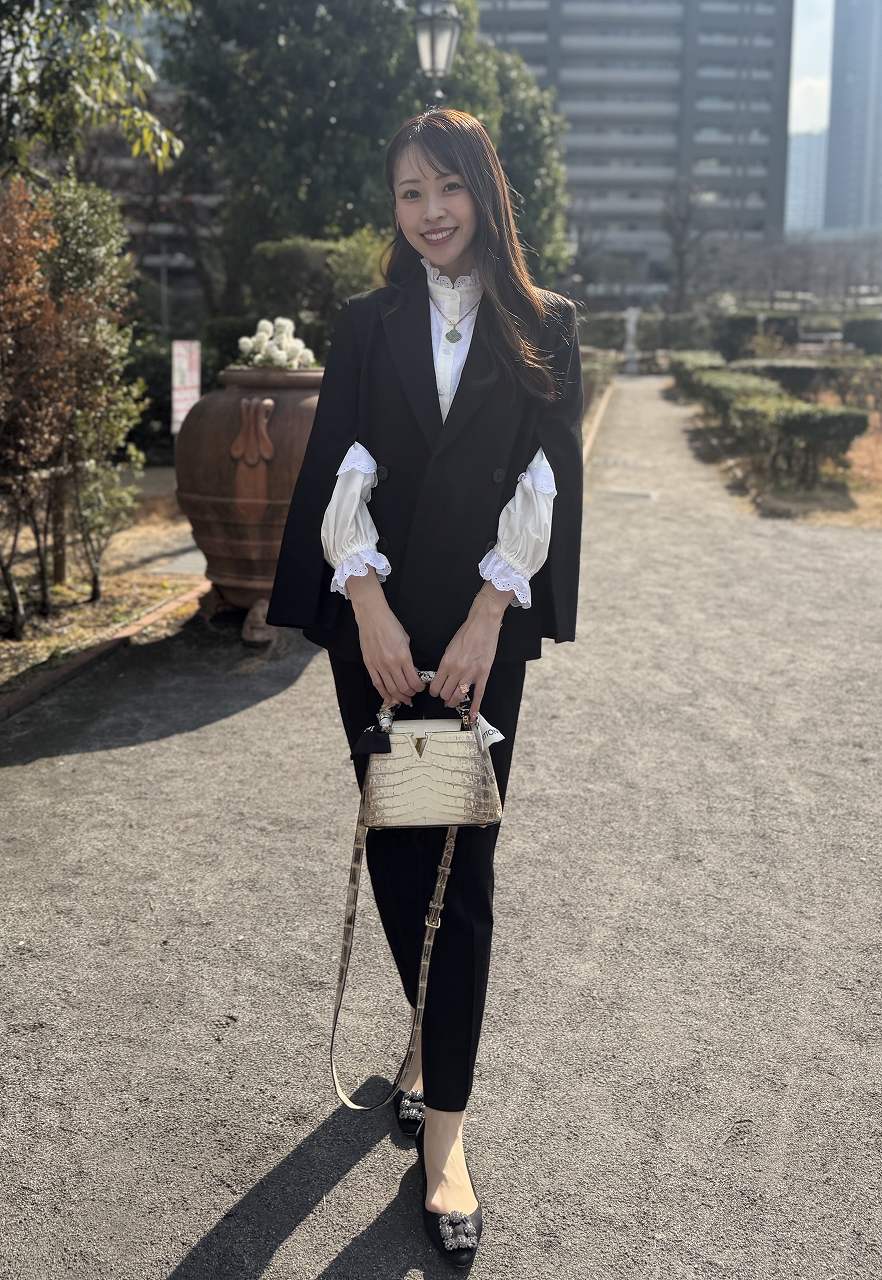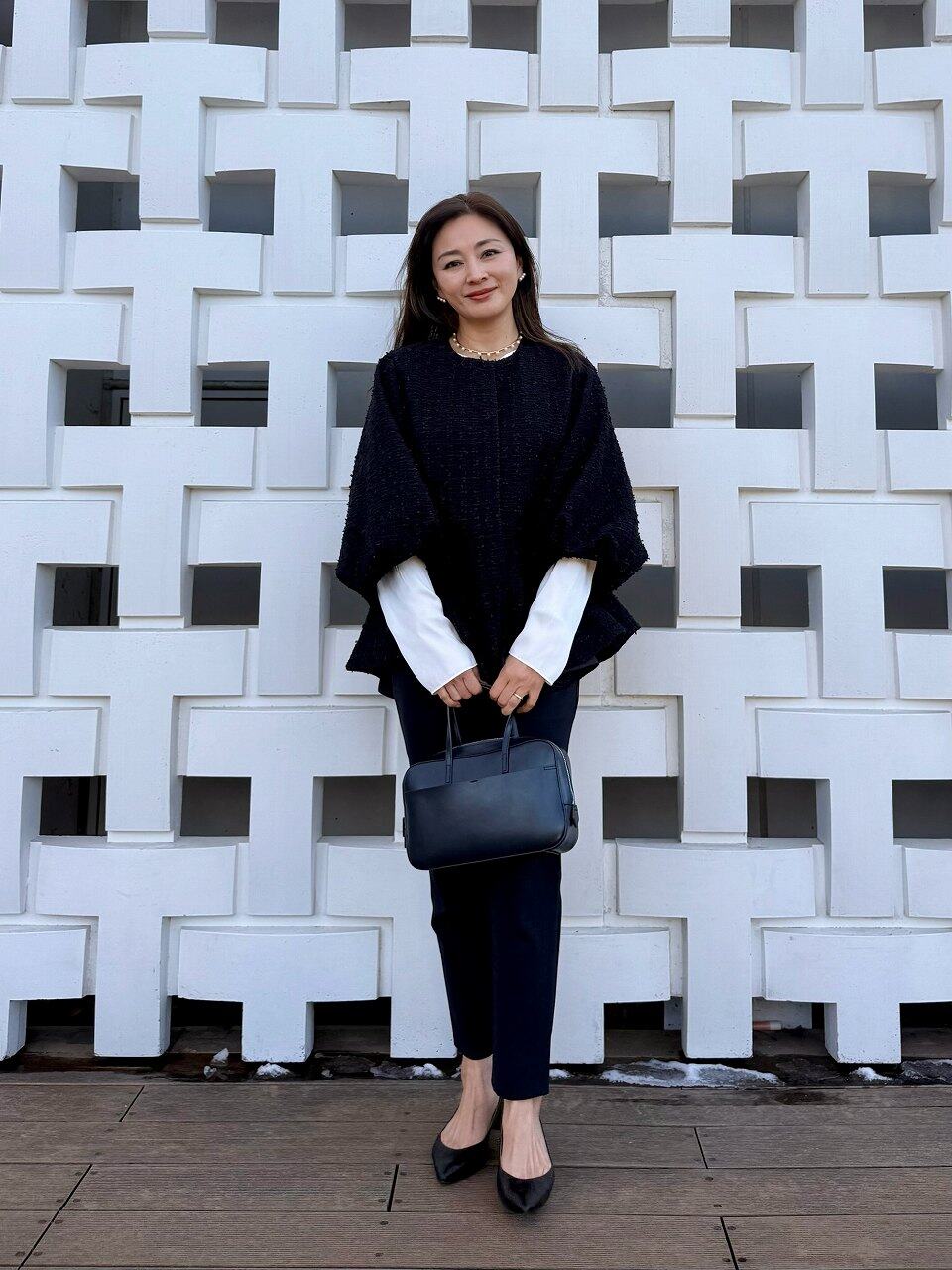 落ち着いた中にもさりげない華やかさを意識しました。上品な存在感のあるツイードは、式典にふさわしいと思いセレクト。あえてセットアップのスカートではなくパンツを合わせることでシャープさを加え、より凛としたフォーマル感を意識しました。足元の冷え対策にもなり、安心して過ごせたのもよかったです。