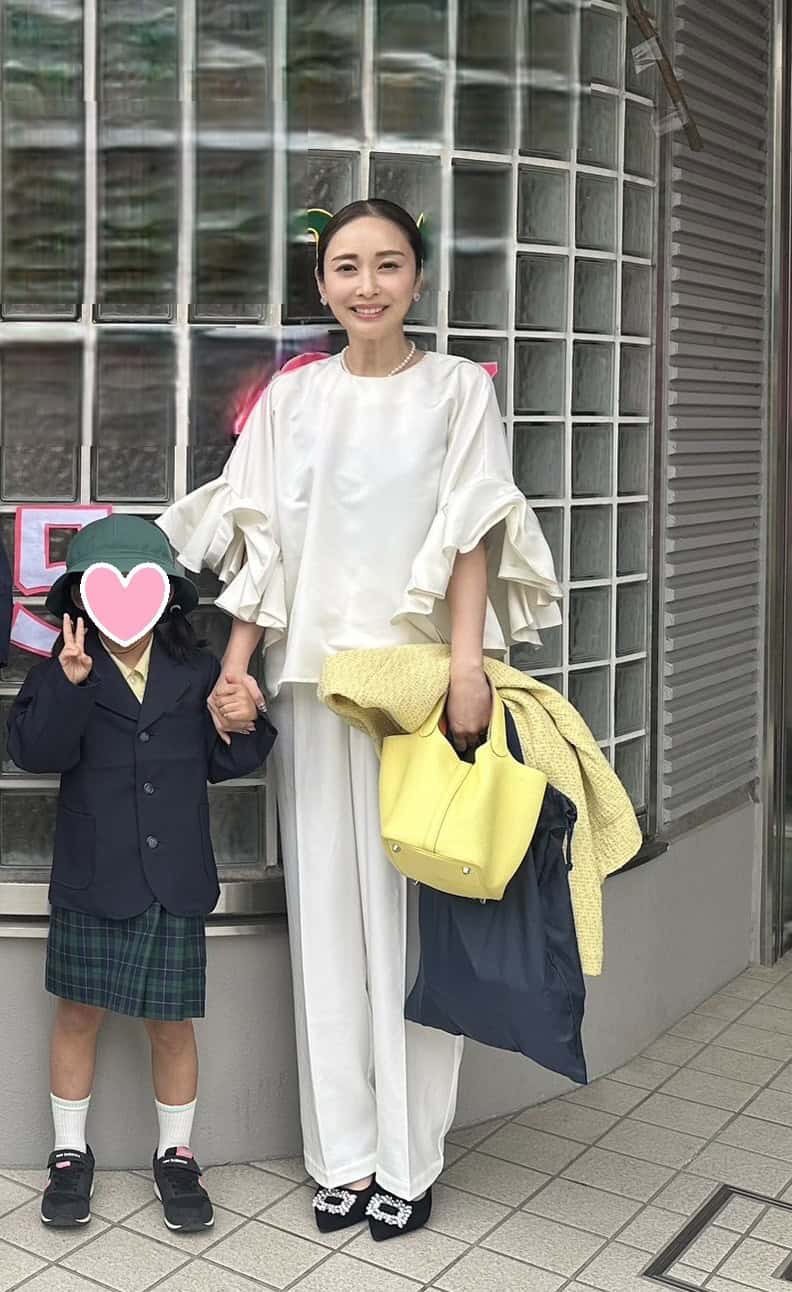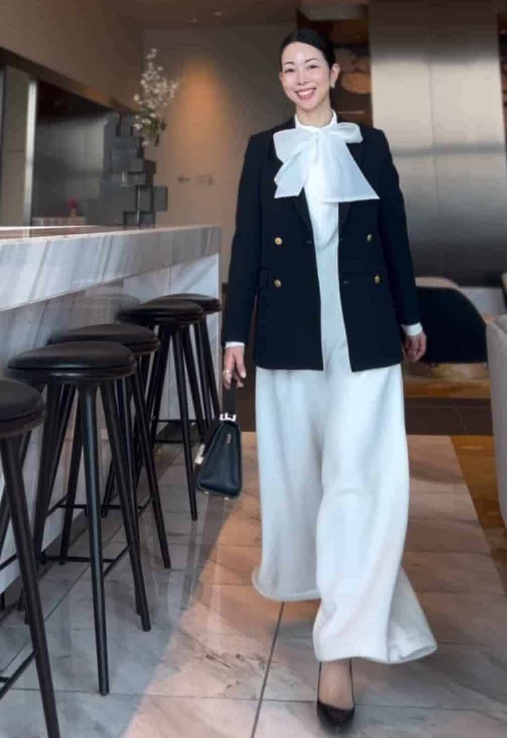 卒園式はかっちりとしたネイビースーツだったので、入学式は明るいカラーを意識しました。ホワイト×ネイビーの爽やかな配色が春らしい軽やかさを演出し、写真映えも意識。カジュアルに傾きすぎないようジャケットで程よくきちんと感を添え、母としての品格と華やかさを両立したセレモニースタイルに仕上げました。