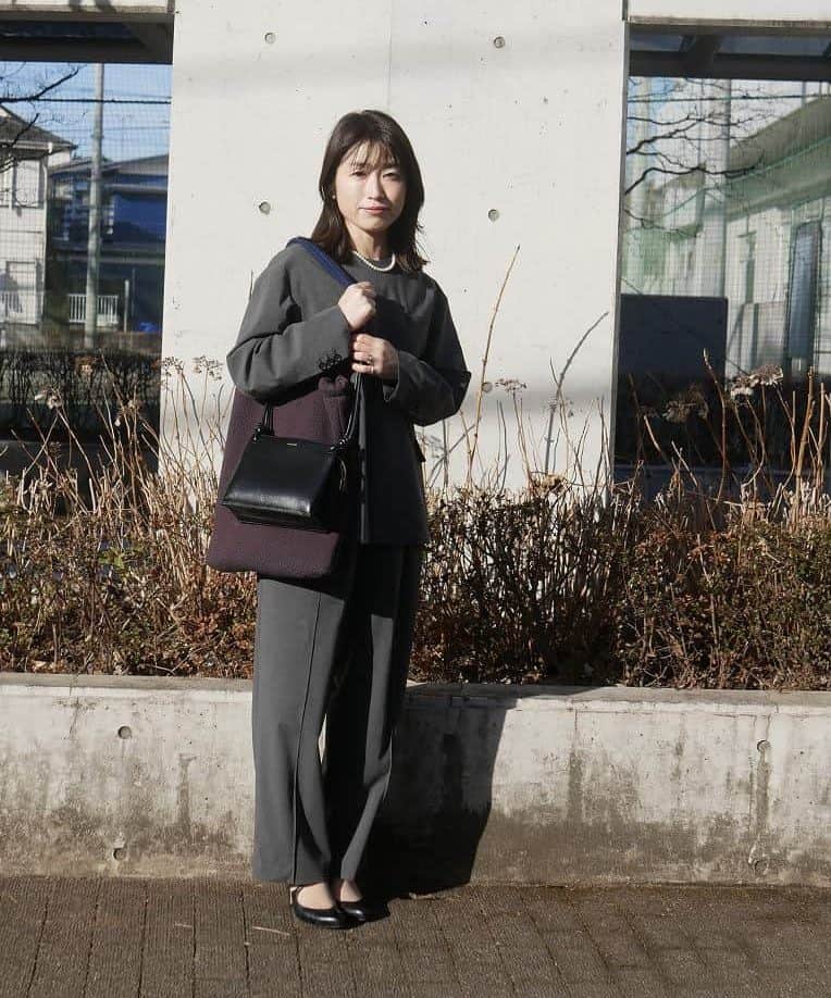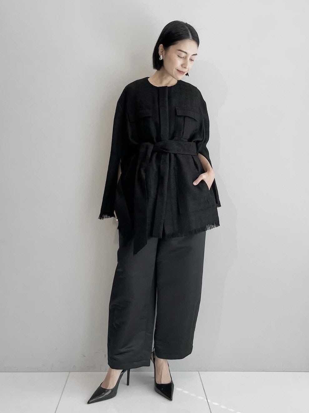 卒入学式の両シーンに対応できるセレモニースタイルは、着慣れている黒やグレーのモノトーンを基調にチョイス。光沢感やツイード素材で上品な華やかさをプラスしました。子どもよりも控えめで品のある印象を大切にしながら、仕事や日常のきちんとした場面にも着回せる一着を選びました。気温差のある季節でもインナーで調整できる実用性も魅力です。