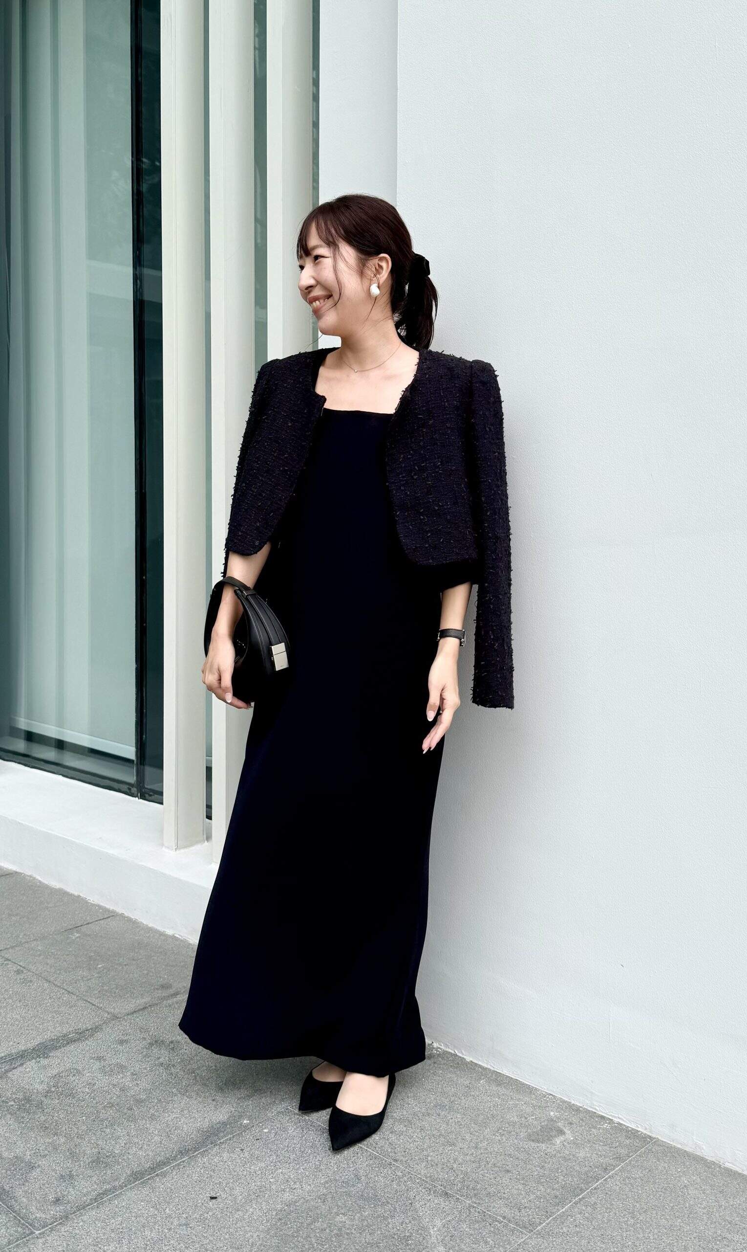 3月まで海外在住のため、手持ちのショート丈ツイードジャケットに合わせて現地でワンピースをオーダーメイドしました。フォーマルさは保ちながらも、スクエアネックやロング丈でかしこまりすぎない柔らかな印象になるように心掛けました。また、大きめのバロックパールのピアスで華やかさをプラス。