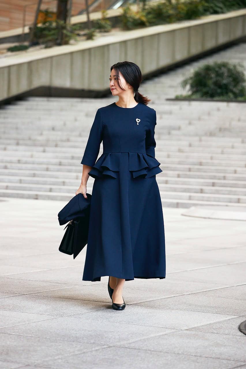 女子校の一貫校で厳粛なお式なため、ネイビーできちんと感が出る装いを意識しました。その中でも自分らしさを表現できるワンピースをセレクト。モードでありながらエレガントなデザインがセレモニーにふさわしいと思い選びました。華やかすぎず、それでいて印象に残るバランスを大切にしています。