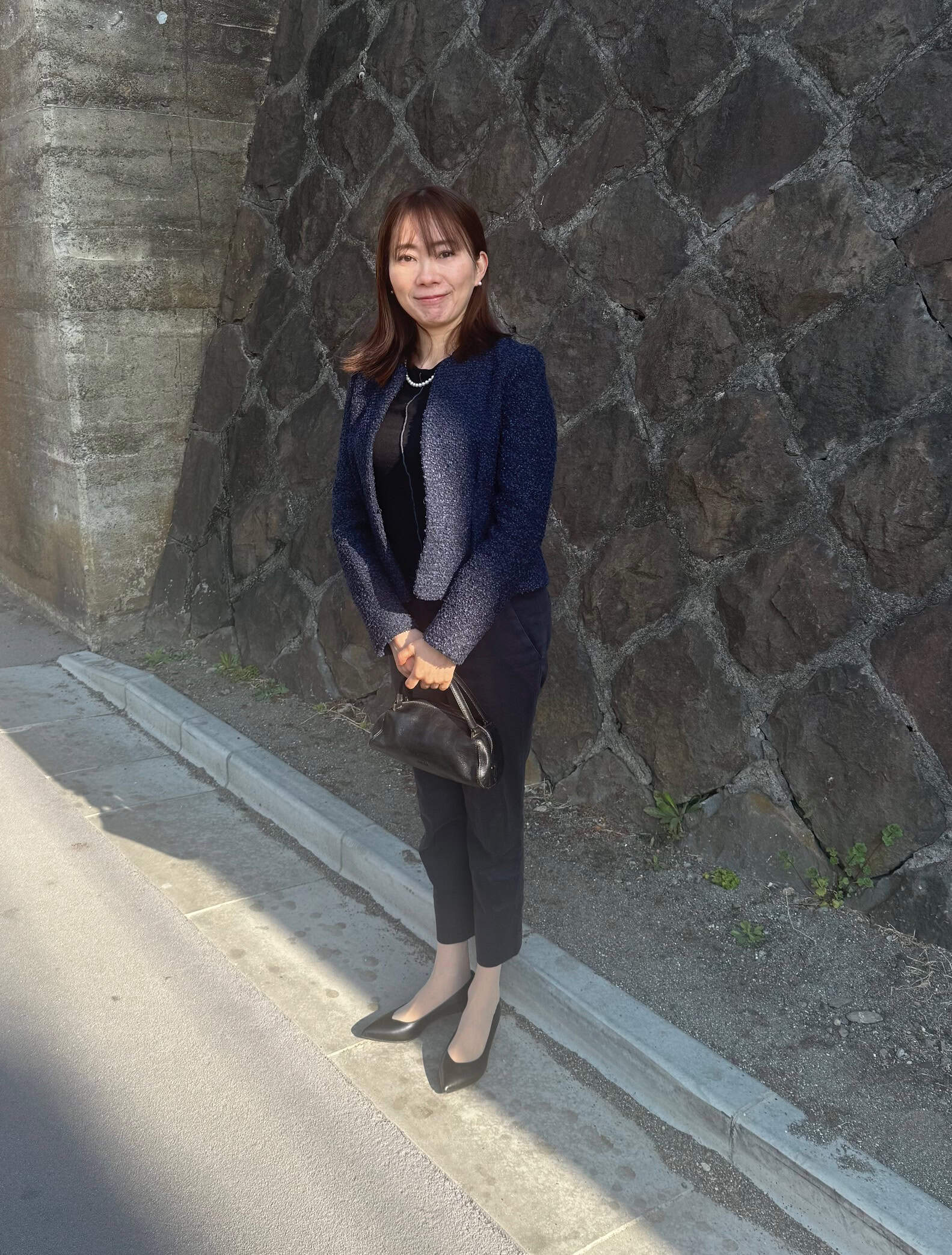 インターナショナルスクールのため、かっちりしすぎない装いを意識しました。普段はブラック派ですが、1年間幼児教室に通ったネイビーママとして、締めくくりもネイビーで。変形ツィードジャケットで個性を添え、パンツは通塾でも重宝したsonoのストレッチを。式後の公園や謝恩会でも動きやすいように考えてコーディネートしてみました。