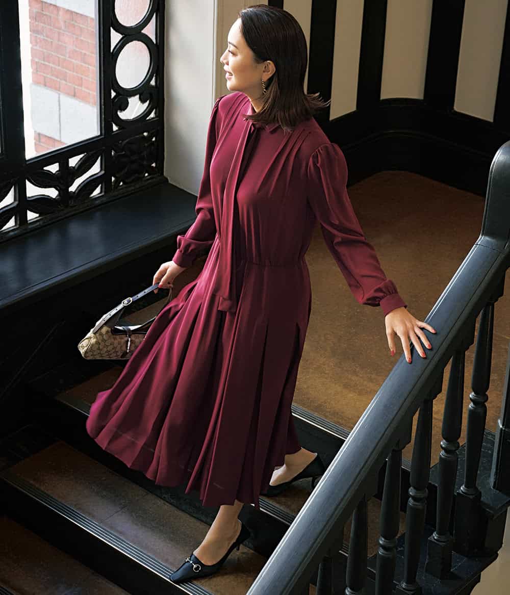 「この上ない極上のソフトレザーと艶感、シャープなフォルム……。芯はありつつ、しなやか。そんな憧れの女性像を体現したような黒パンプス。踵を織り込んで履ける軽やかな抜け感も、今のムードにマッチします」(モデル・蛯原さん)