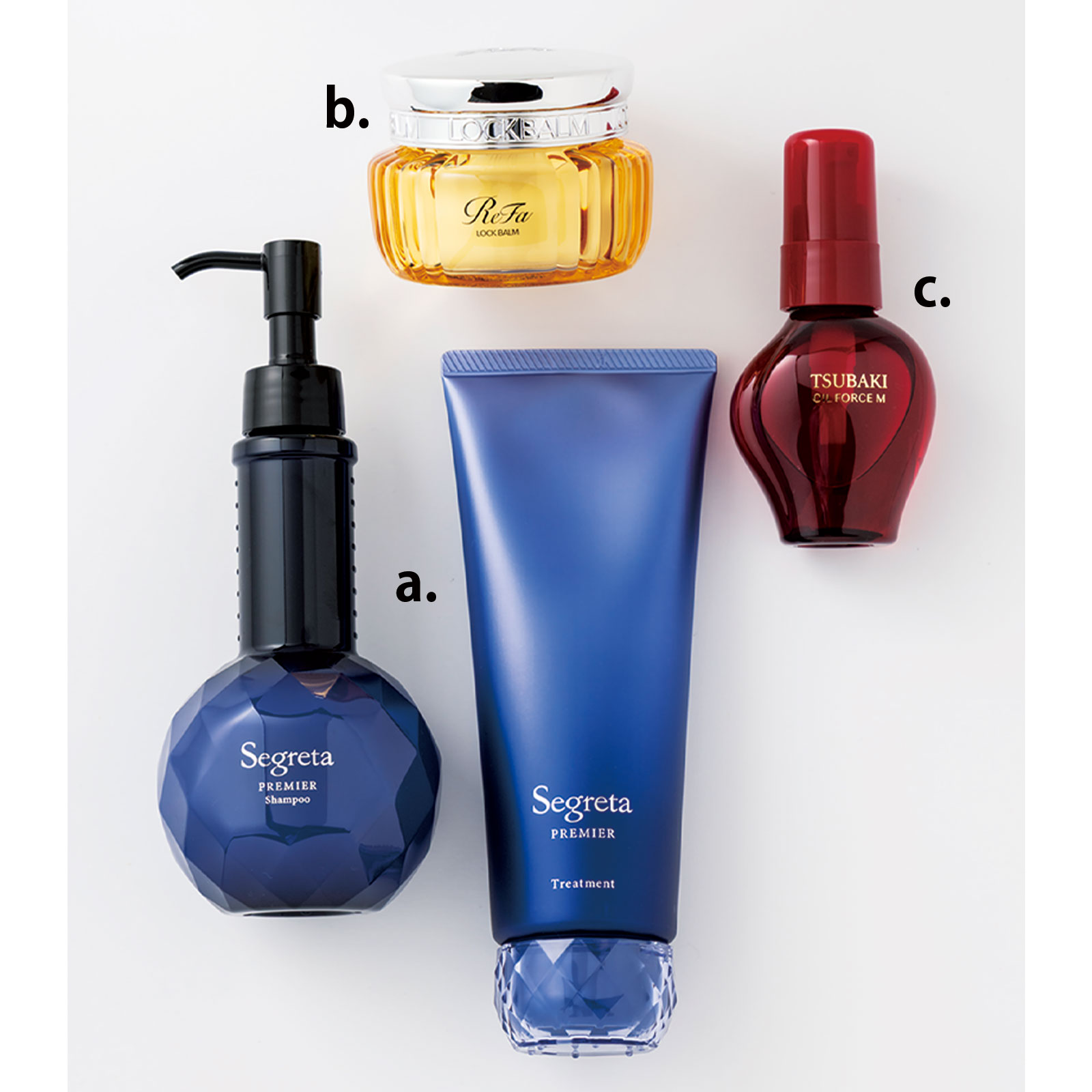 a.豊かな美容液成分がショートを扱いやすいなめらかな髪に。セグレタ プレミア 凝縮美容液シャンプー200ml質感変化トリートメント200g各¥2,420〈編集部調べ〉(ともに花王)b.短い髪の動きを作るのに最適なバーム。リファロックバーム50g¥3,300(MTG)c.髪の脂質組成に近い椿オイルフォースが配合されたベタつきのないオイル。TSUBAKI オイルフォース M 60mlオープン価格〈編集部調べ〉(ファイントゥデイ)