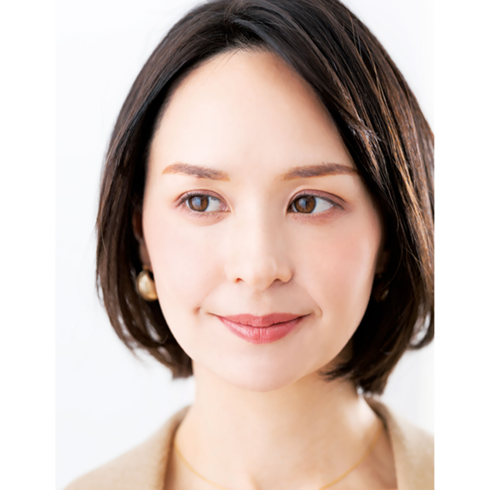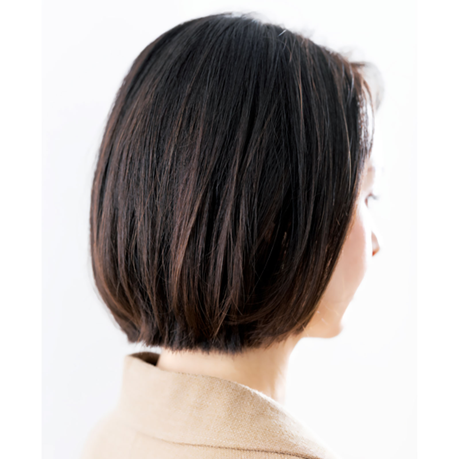 「アゴの高さでカットしたワンレンベースのショート。毛先に厚みが出ないように毛先3cmにレイヤーを入れ、後ろは髪が溜まりやすいので毛量調整します。おでこを出すので前髪は鼻先くらいの長めでカット」