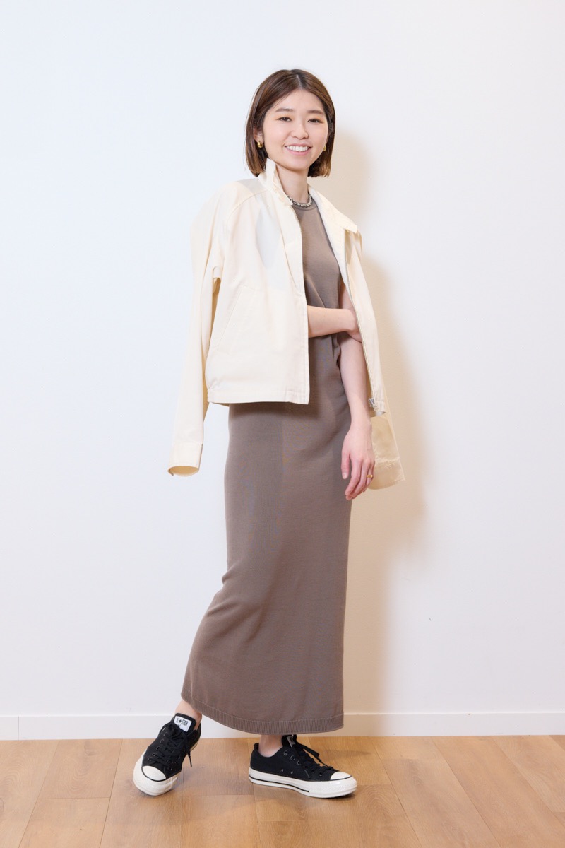 【ワンピースコーデ】コットンブレンドショートブルゾン¥5,990 3Dコットンニットワンピースノースリーブ¥4,990(すべてユニクロ ユー/ユニクロ)その他ライター私物