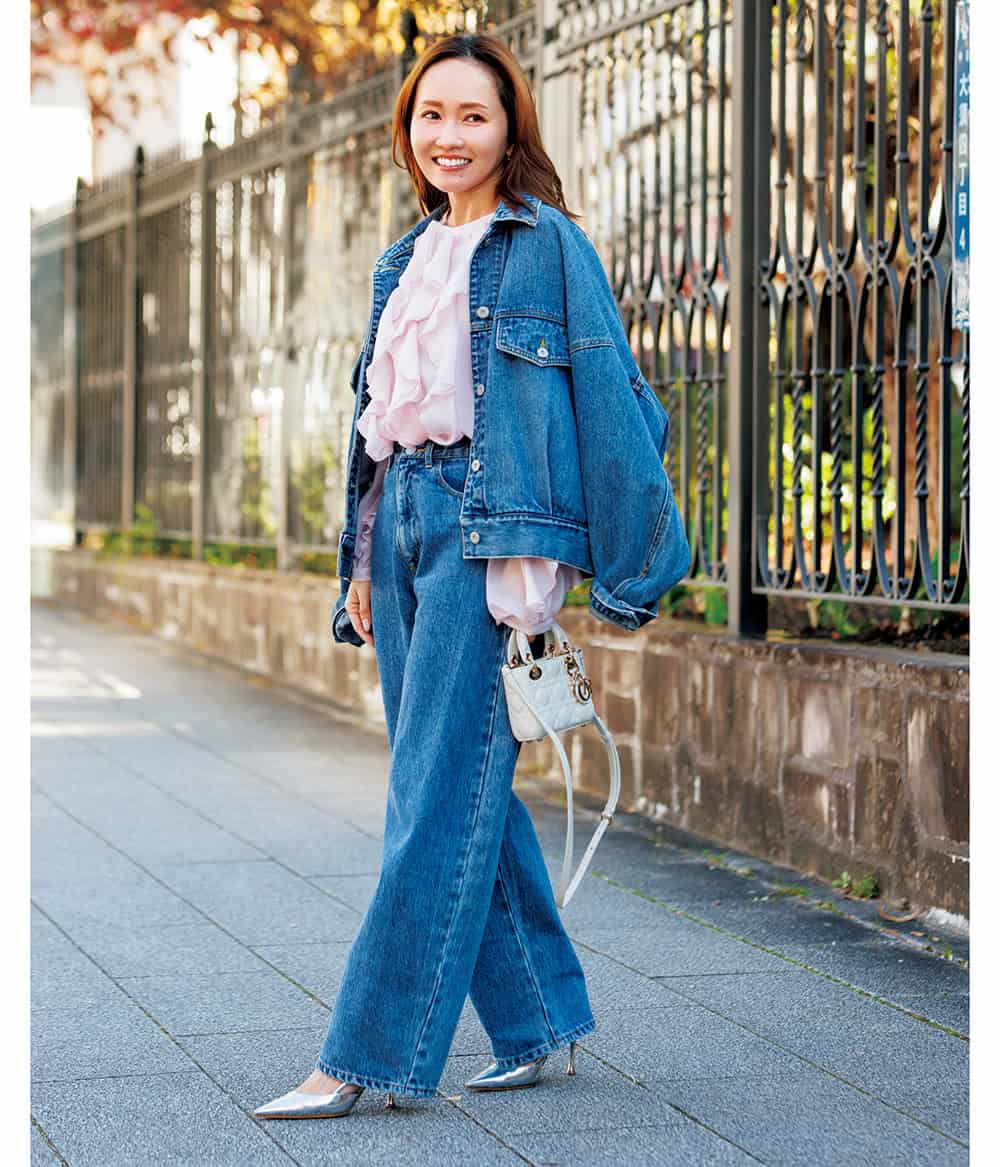 『デニム×デニムスタイルが好きで、特にフリルブラウスを合わせると華やかに見えるので嬉しい。ブラウスの下にヒートテックを入れても響かないのもポイント。』