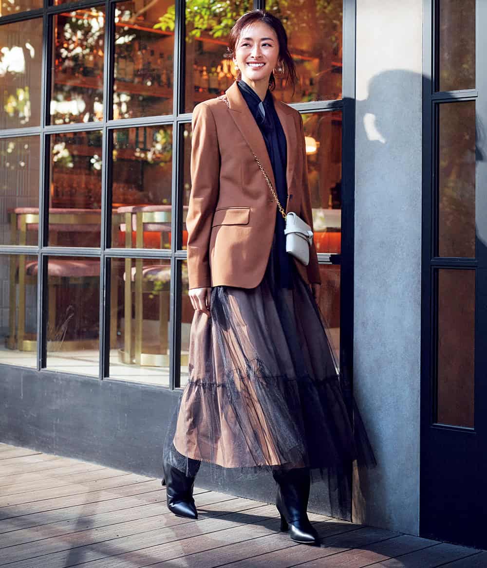 ジャケット¥46,200(ステュディオス/ステュディオス ウィメンズ 表参道店)シャツ¥7,990(UNIQLO)スカート¥55,000〈オブリオ〉バッグ¥72,600〈マエストソ〉(ともにオブリオ)ショートブーツ¥16,990(ステッピ/オンワード樫山)ネックレス¥99,000(スワロフスキー・ジュエリー/スワロフスキー・ジャパン)