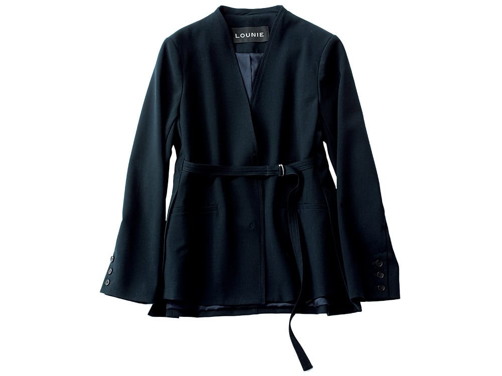 付属のレザーベルトは結び方で印象が変わります。定番フォルムのジャケットは色選びでも差をつけたい。