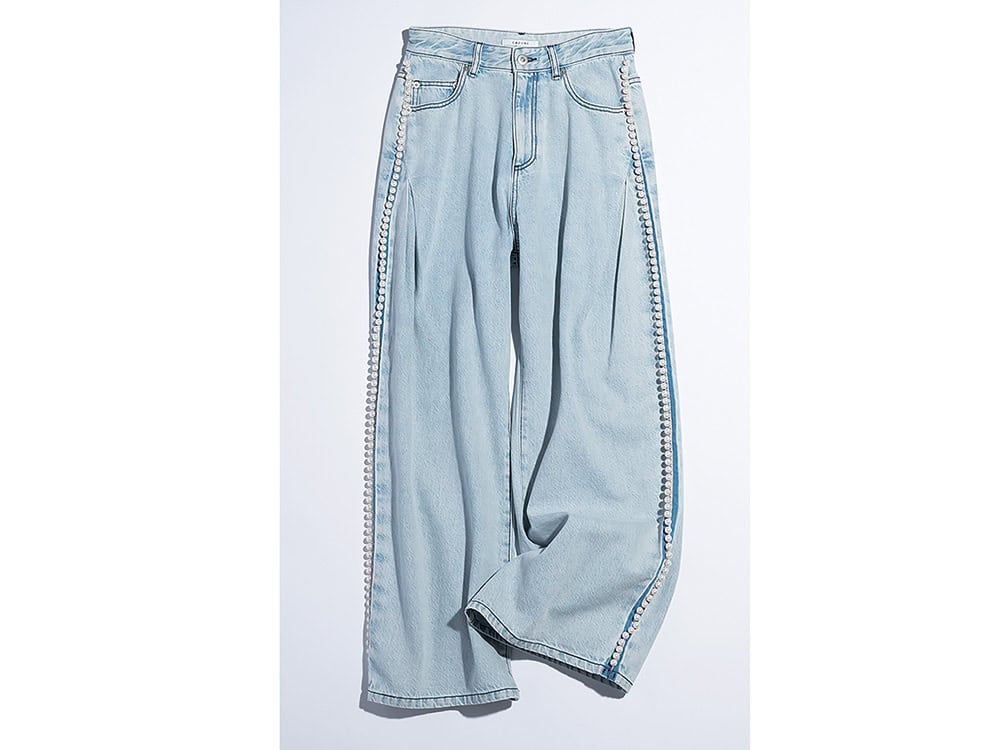 大好きな甘カジュアルがこれ一枚で完成♡ 今季はデニムが豊作。中でもサイドにパールをあしらったデニムは甘好きにはたまらない可愛さ。辛めのロゴトップスと合わせて、春の甘辛コーデをぐんと盛り上げたい!(ライター 端迫絵実)