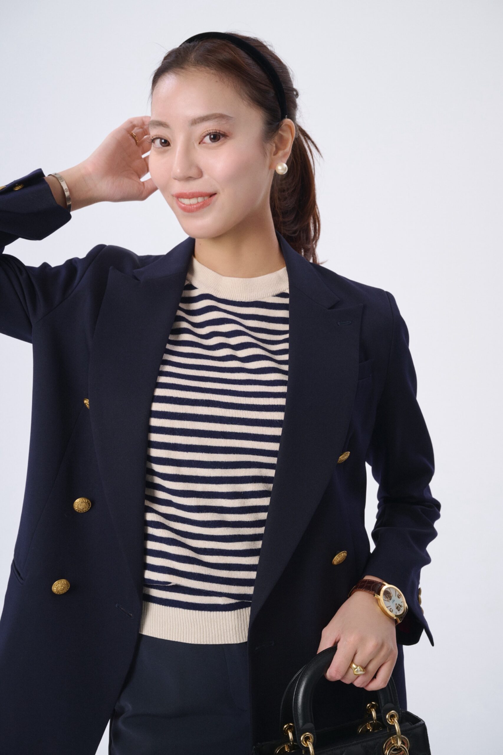 「ジャケットが好きで、普段のコーディネートにもよく取り入れています。仕事の日はもちろん、休日も自然と手に取ることが多くて、オンオフ問わず活躍してくれるアイテム。羽織るだけでコーデ全体が引き締まるところも好きです。中でもよく着ているのが紺ブレ。もう5年くらい愛用していて、どこに着て行ってもサマになる安心感があります。選ぶのは必ずボタンがゴールドのもの。シンプルなコーディネートでも、金ボタンがアクセントになってくれるところが気に入っています」