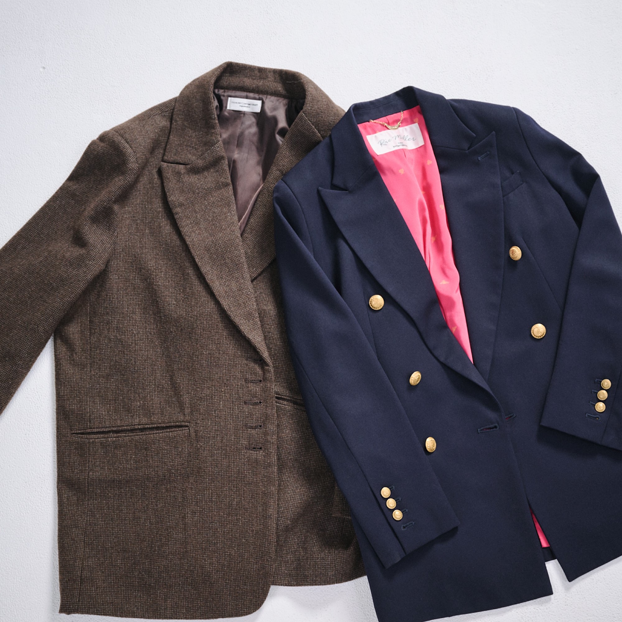 〈左〉room 306 contemporaryのジャケット。ブラウンチェック柄が今っぽくてお気に入り。昨年から気になっていたブラウン。〈右〉Rie Millerのジャケットはオーソドックスなデザインで着回しやすい一着。シンプルだからこそ合わせるアイテムを選ばず、オンオフ問わず活躍しています。