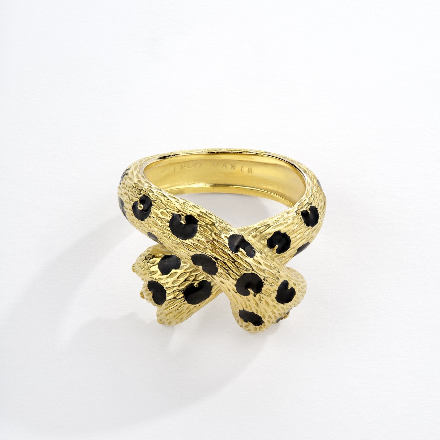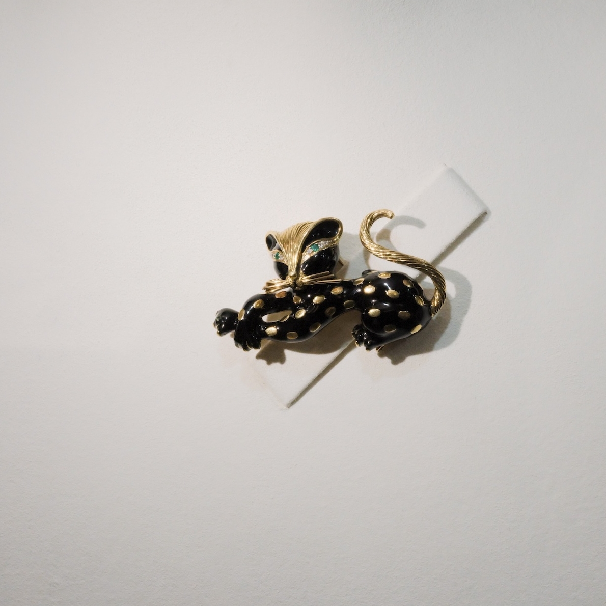レオパードの前足をクロスさせたデザインが可愛い「オンブル フェリーヌ」。こちらのコレクションを語るうえで外せないのが、モナコのグレース王妃です。1976年、モナコのフレッドブティックのオープン記念パーティに主賓としてグレース王妃が出席、その際、身に着けていたのが、愛用していたこのコレクションのリングで、それを見たフレッド・サミュエルは大いに感動したそう。今回、レオパードの全身がモチーフとなったブローチとブレスレットの展示もありましたが、こちらは1960年代の作品だそうで、こちらが前足だけのデザインの前身だったことを知りました。本当に愛くるしいお顔のレオパードでした。
