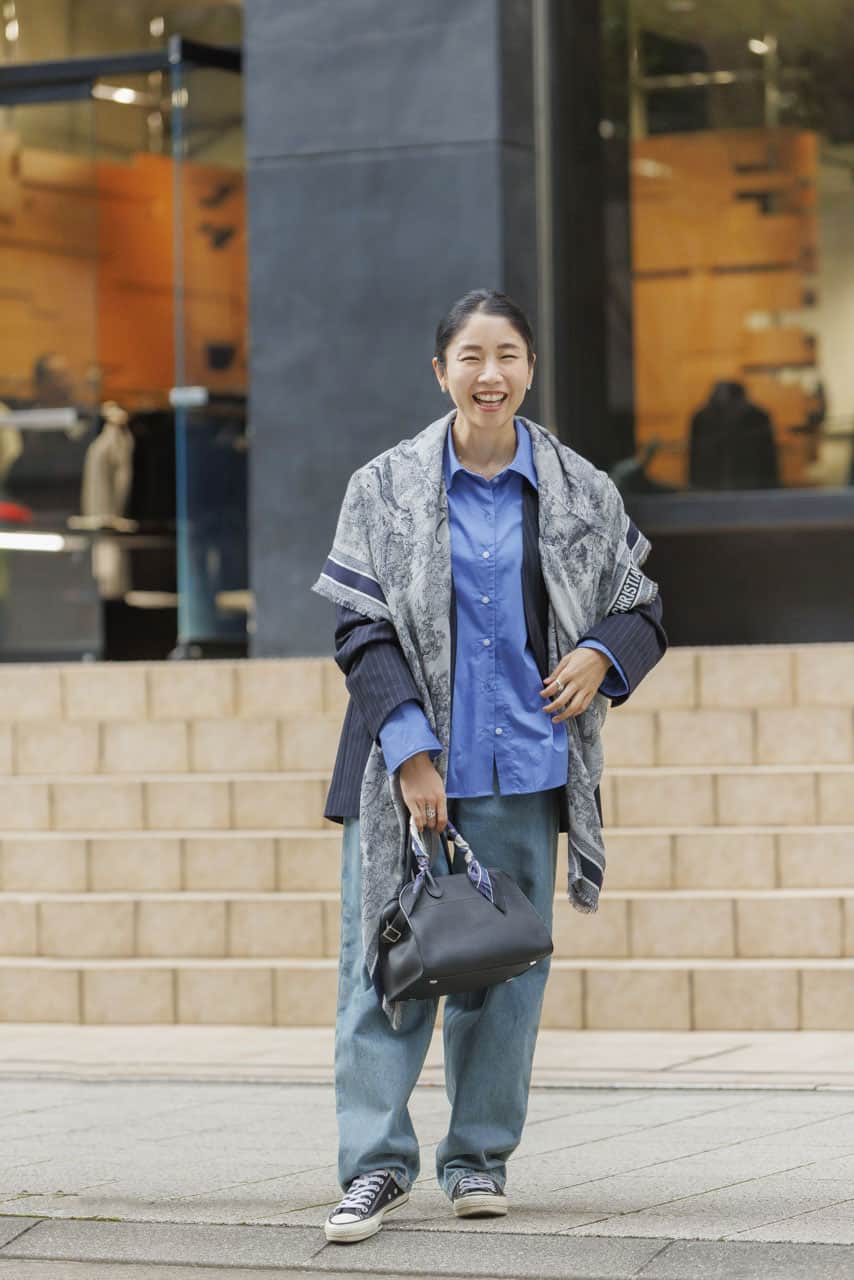 ストールは2025年の春に買ったもの。色合いや柄が合わせやすく、デニム合わせをしたいと思い購入。マダムになりすぎないよう、きちんと感の中にもカジュアルに落とし込んでリラックスした雰囲気を意識しました。春夏はワンピースの上にサラッと巻いて日焼けや冷房対策にも活躍してくれそう。
