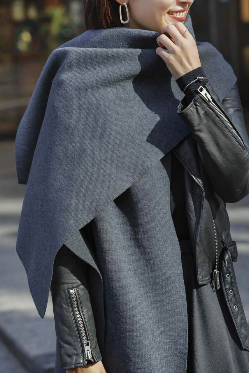 普段からモノトーンが好きなので小物の素材感を変えて奥行きを出すように気をつけています。大判ストールはニット素材で洗えることや、気負わず巻ける気軽さがお気に入り。ライダースの辛さを、ニットストールで緩和してグレーカラーで抜け感を意識しました。海外スナップを参考にしています。