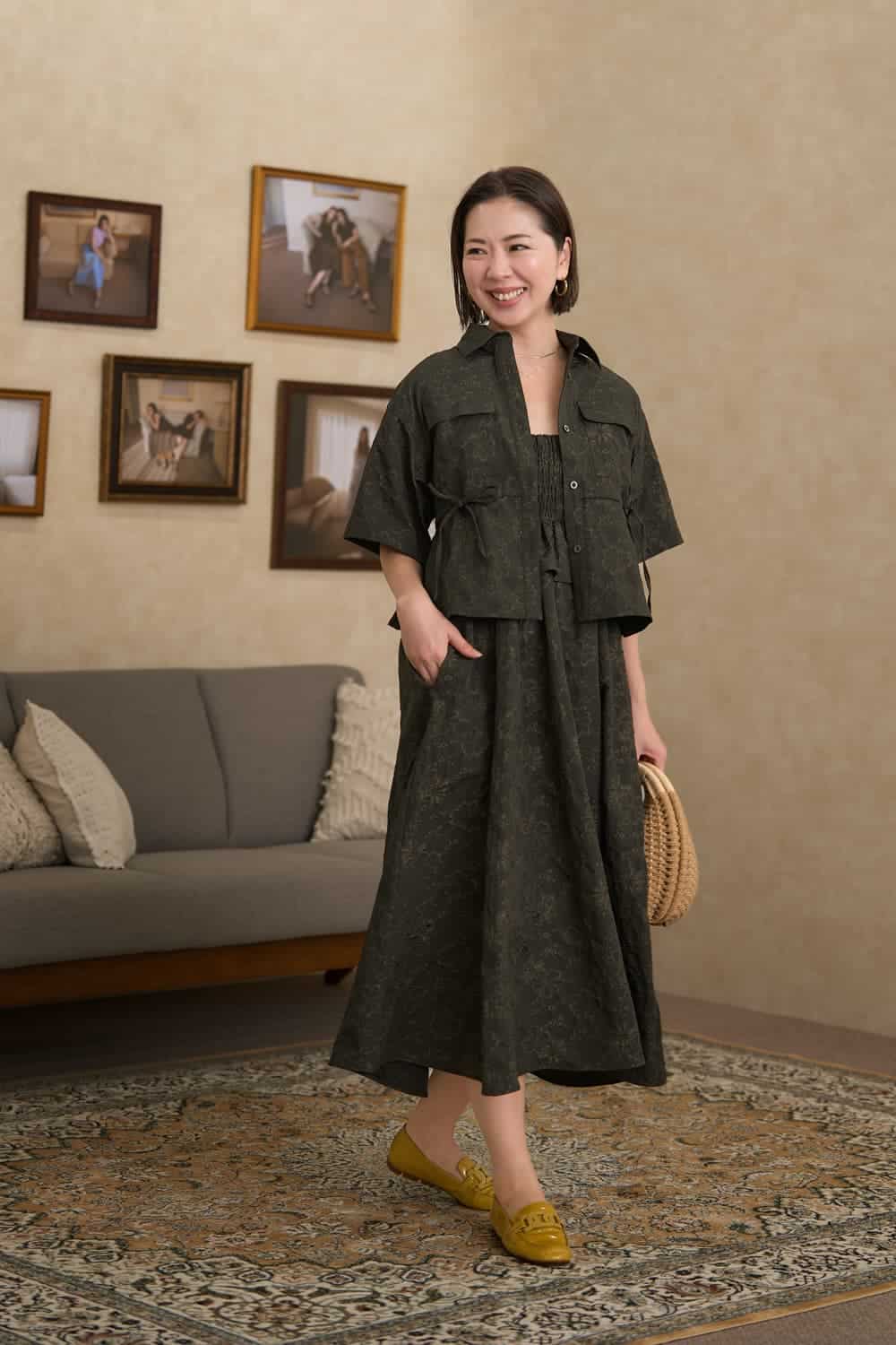 「セットアップで着たくなる同色のワンピースとシャツは、目にした瞬間思わず手に取った一目ぼれアイテム。バスト下から広がるAラインのフレアワンピースがボディーラインをカバーし、脚長効果も期待できます。ジャケットのように羽織る短丈シャツは、ウエスト部分のドロストで表情を変え、バランスよく着こなせるのも魅力。シックなダークグリーンに立体感のある花柄のジャガード生地がエレガントで、ホテルランチにもピッタリ!」