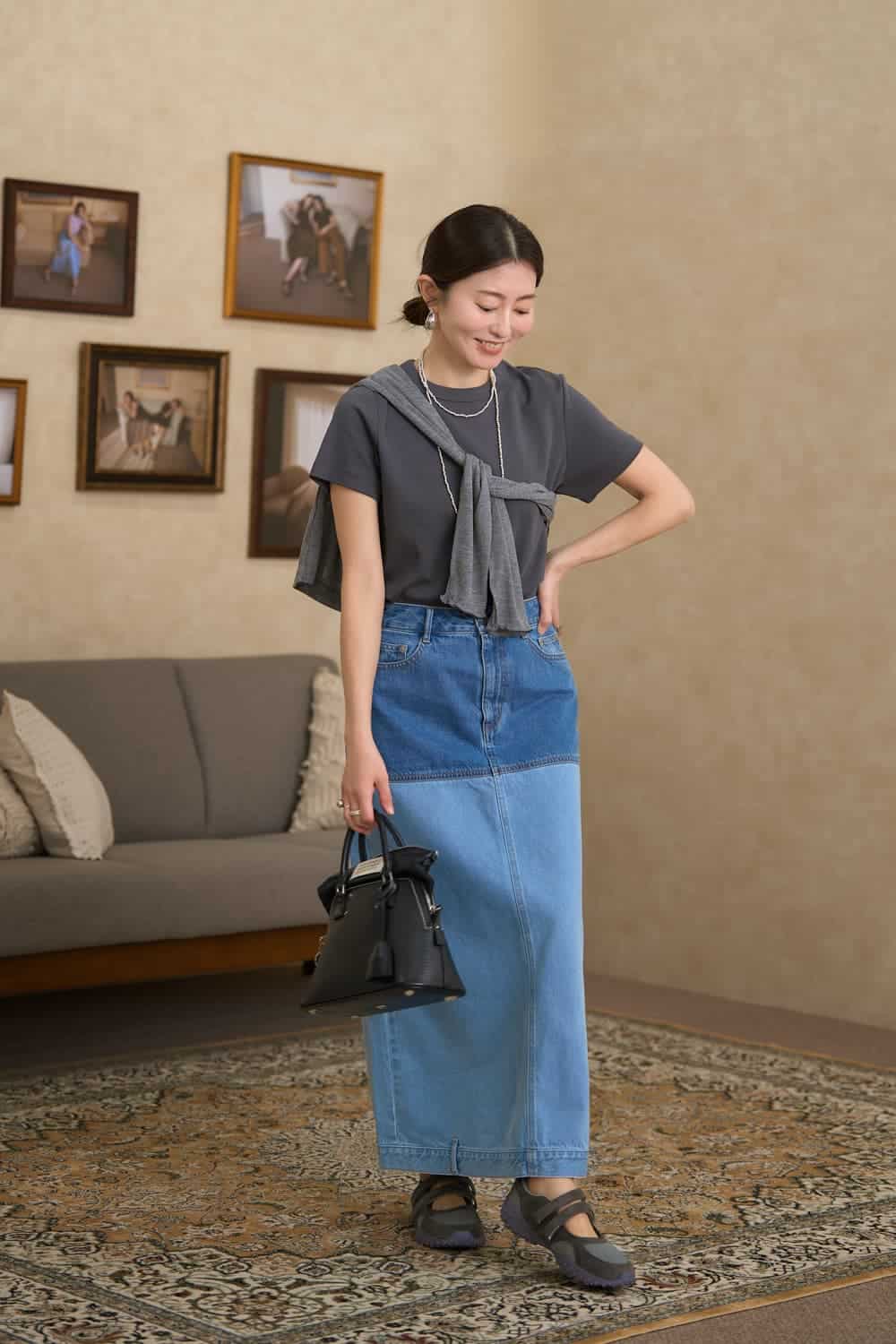 「公園ピクニックでもおしゃれを楽しみたい日に。定番の“Tシャツ+デニム”に少し飽きたら、デザイン性のあるデニムスカートにチェンジするのがオススメです。今回着たのは、2トーンカラーが目を引く一枚。裾にはrokhらしい遊び心のあるデザインが効いていて、シンプルなコーデもぐっと新鮮に。後ろスリット入りで動きやすさも◎足元は、ストラップバレエスニーカーで抜け感をプラスしました」