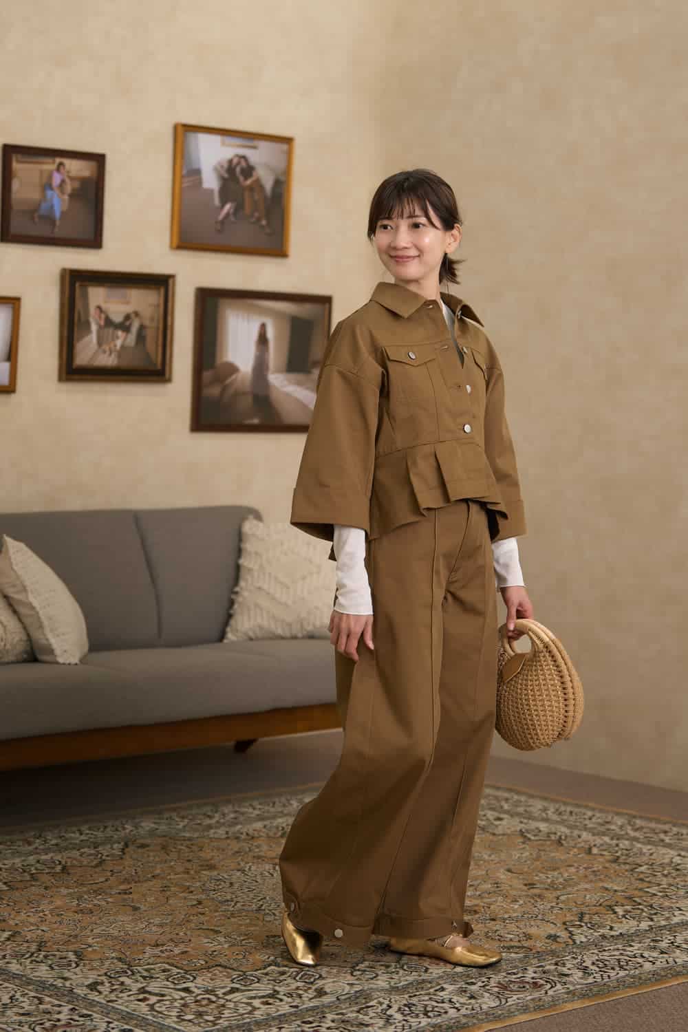 「ペプラムデザインのブルゾンが目を引くセットアップ。着るだけで立体的なシルエットが生まれ、前を留めればトップス風にも楽しめます。パンツも細部までこだわったデザインで、カジュアルすぎず女性らしくはけるのも魅力。家族との春の休日にもぴったりのコーデです」