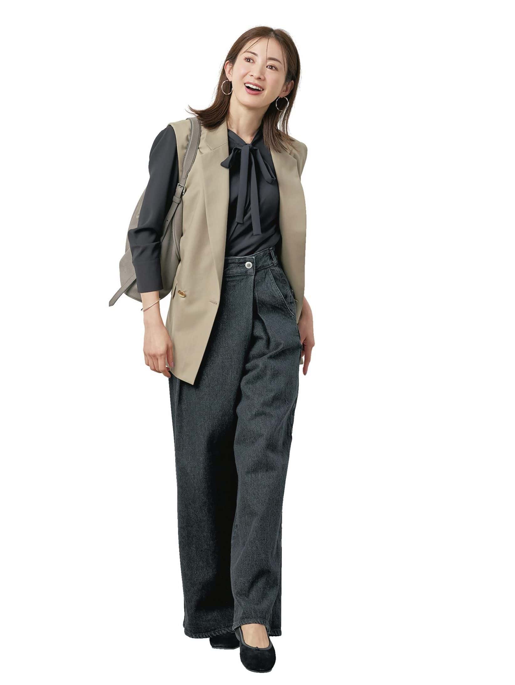 デニムパンツ¥22,000(サムシング/エドウイン・カスタマーサービス)ジレ¥129,800(マッキントッシュ/マッキントッシュ 六本木ヒルズ店)ブラウス¥28,600(セオリー/リンク・セオリー・ジャパン)バッグ¥209,000(J&M デヴィッドソン/J&M デヴィッドソン カスタマーセンター)バレエシューズ¥30,800(シーセイ/アイネックス)ピアス¥8,800(アビステ)バングル¥9,350(ココシュニック オンキッチュ/ココシュニック)