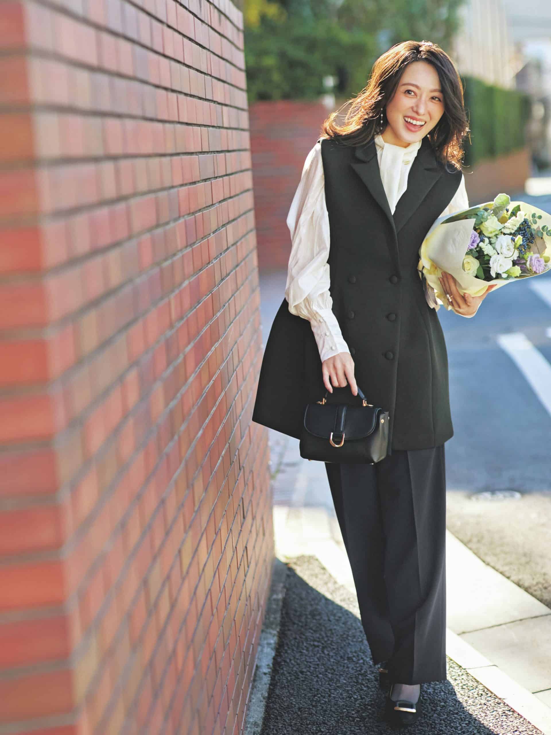 ジレ¥13,800ブラウス¥6,420(ともにミュー)パンツ¥15,950(DAY by DAY It,s international)バッグ¥22,900(チャールズ&キース/チャールズ&キース ジャパン)パンプス¥33,000(銀座かねまつ/銀座かねまつ6丁目本店)ピアス¥27,500〈ebiki〉リング¥18,700〈yuma〉(ともにロードス)ストッキング¥1,100(靴下屋/タビオ)