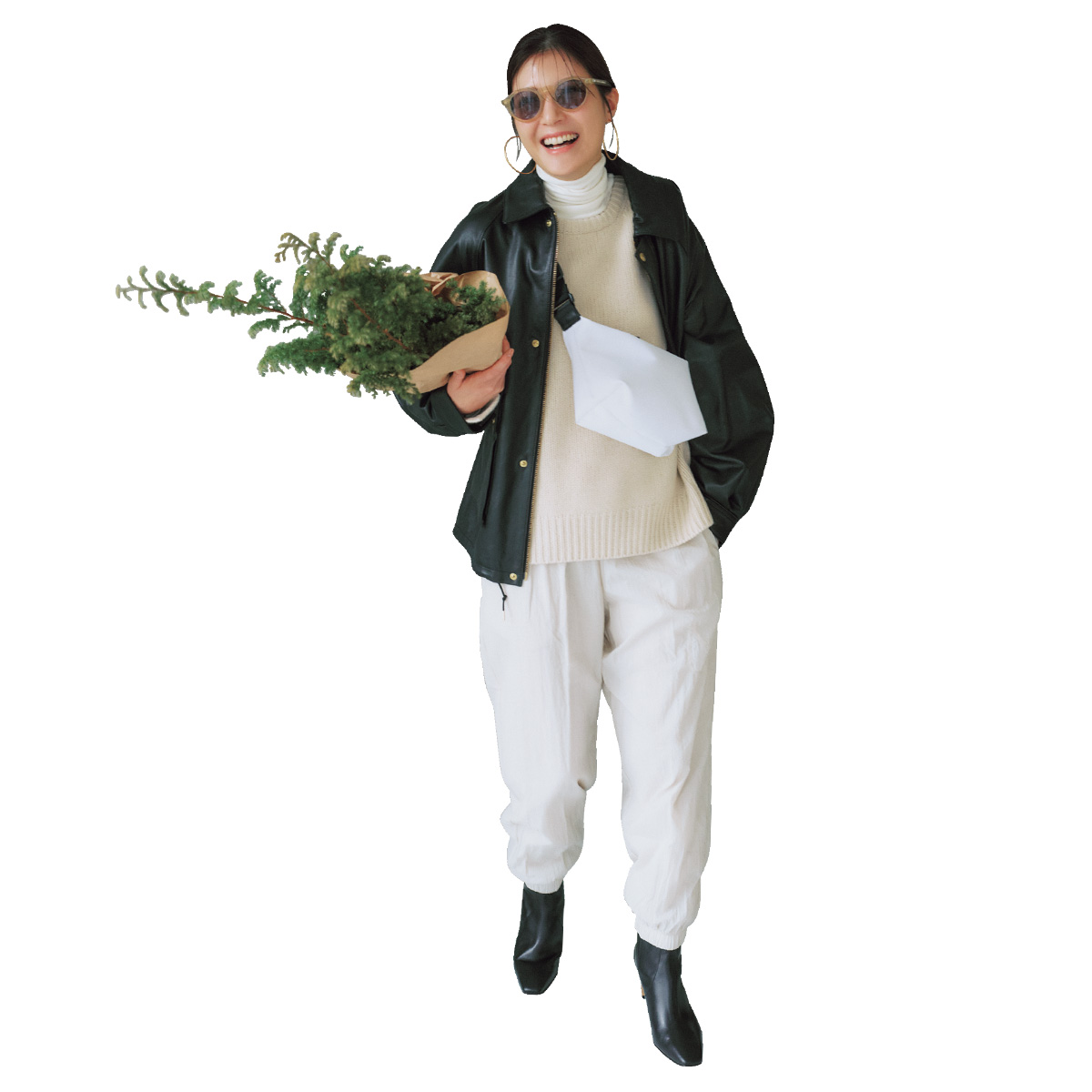 パンツ¥12,430(ナイキ スポーツウェア╱ナイキ カスタマーサービス)ジャケット¥107,800(トラディショナル ウェザーウェア╱トラディショナル ウェザーウェア 渋谷店)ニット¥44,000(ザハイライツ)カットソー¥11,000(エミ╱エミ ニュウマン新宿店)バッグ¥14,300(Y╱イレーヴ)靴¥29,150(ダイアナ╱ダイアナ 銀座本店)サングラス¥47,300(アイヴァン╱アイヴァン 東京ギャラリー)ピアス¥143,000(モニス╱フォーティーン ショールーム)