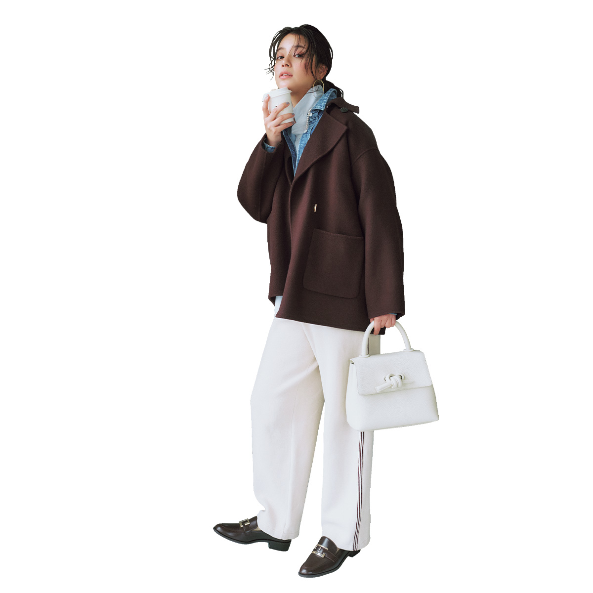 パンツ¥25,300(サロン アダム エ ロぺ)コート[取り外し可能なストール付き]¥66,000(カデュネ╱カデュネ プレスルーム)デニムシャツ¥47,300(サードマガジン)シャツ¥31,900(ギャルリー・ヴィー╱ギャルリー・ヴィー 丸の内店)バッグ¥56,100(VASIC╱ヴァジックジャパン)靴¥18,150(ダイアナ╱ダイアナ 銀座本店)ピアス¥14,300〈サローネ サーティ〉ネックレス¥37,400〈モニス〉(ともにフォーティーン ショールーム)ソックス╱スタイリスト私物