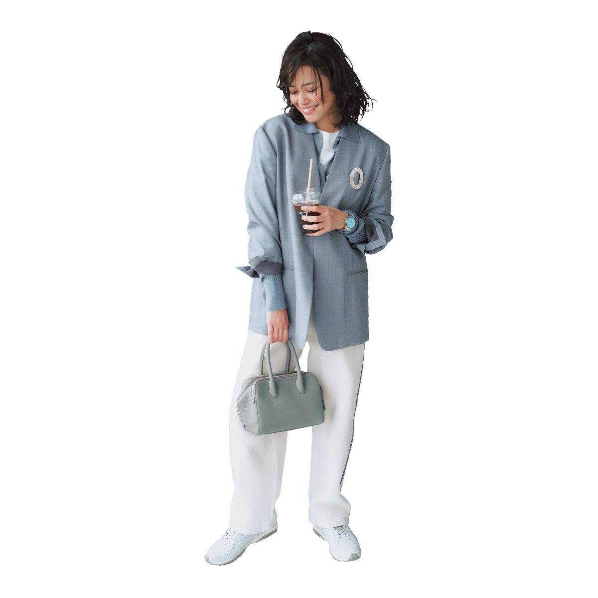 パンツ¥25,300(サロン アダム エ ロぺ)ジャケット¥108,900(エイトン╱エイトン青山)ニット¥47,300(イレーヴ)カットソー¥15,400(アナイ)バッグ¥53,900(VASIC╱ヴァジックジャパン)靴¥16,940(ニューバランス╱ニューバランスジャパンお客様相談室)ブローチ¥26,400(アドラル╱ZUTTOHOLIC)時計¥46,200(ナバル ウォッチ╱オンタイム 渋谷ロフト店)ネックレス¥62,700(シェルビー╱シェルビー 表参道)