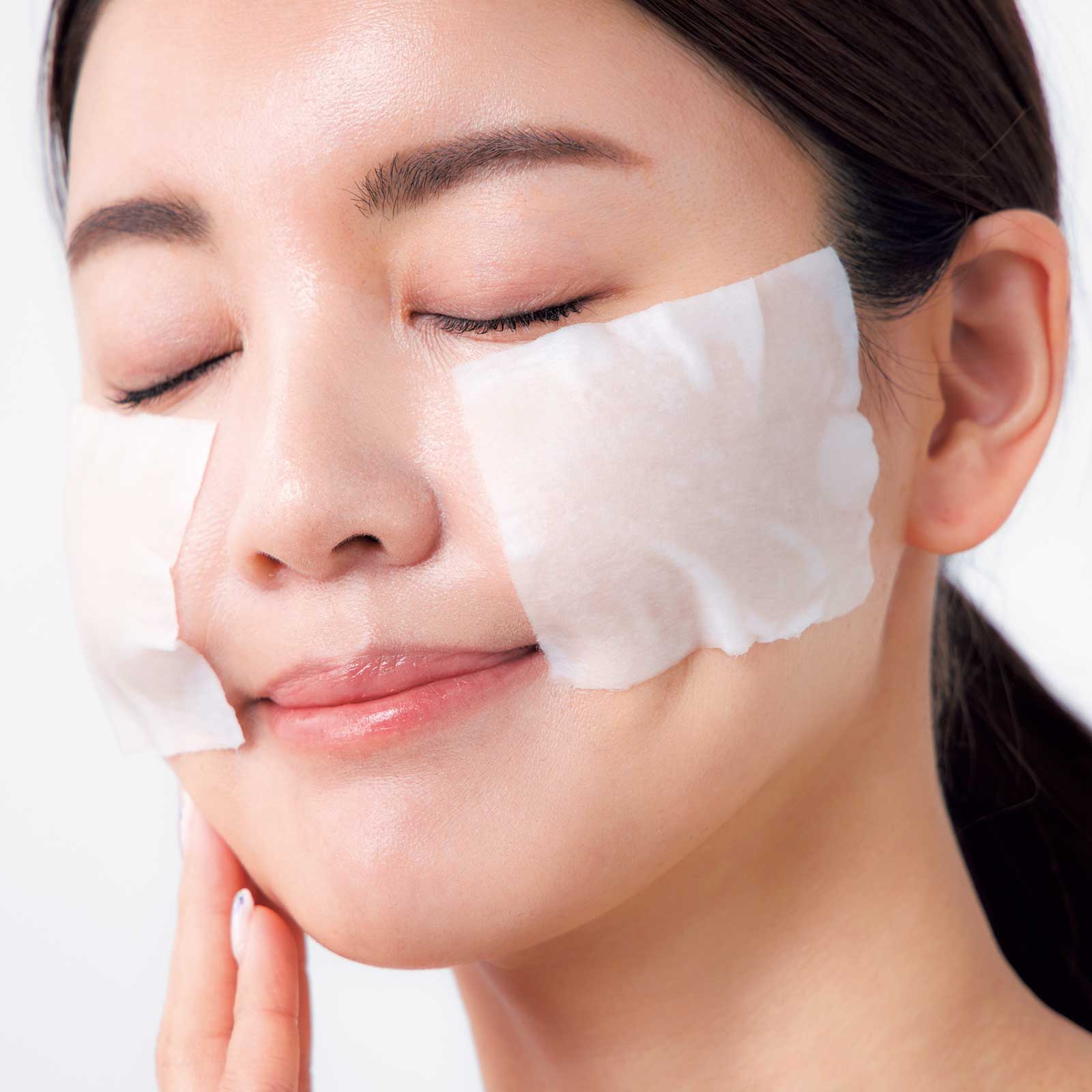 コットンにローションをたっぷり浸して、頰にパック。じっくり化粧水を入れ込むことで、毛穴がふっくら。肌が柔らかくなり、その後のスキンケアの浸透も良くなります。
