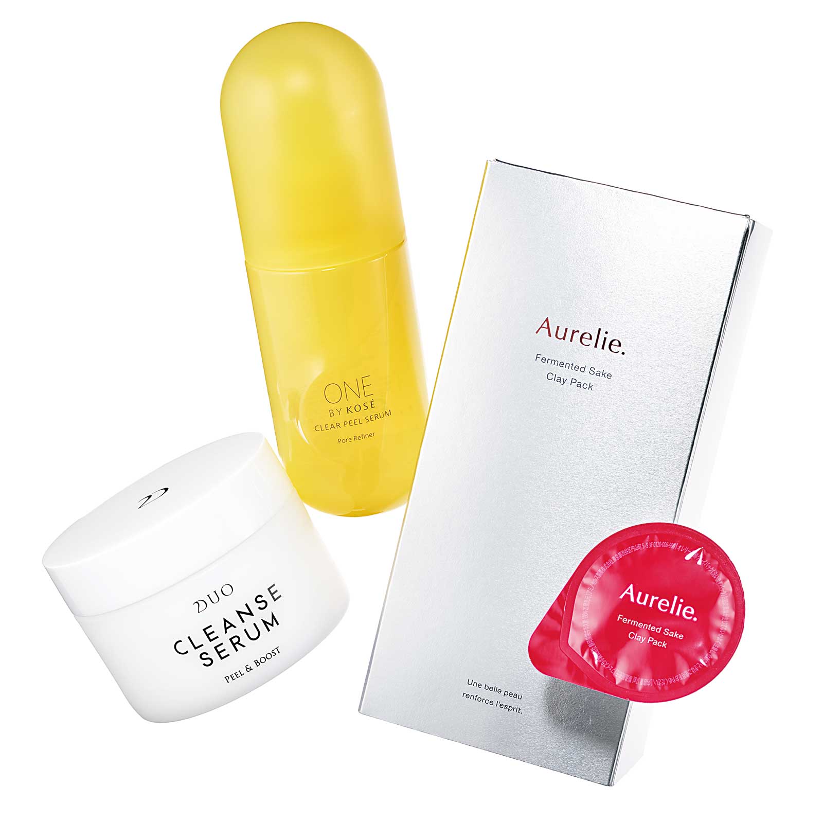 ゴワつきもくすみもオフ。(左から)古い角質をゆるめてターンオーバーを正常化。スキンケアが浸透しやすい肌に。デュオ クレンズセラム ピール&ブースト 90g ¥4,620(プレミアアンチエイジング)洗顔後にさっと拭き取るだけで毛穴づまりを一掃。角栓の元ができにくい肌に。ONE BY KOSÉ クリアピール セラム 120㎖ ¥3,850〈編集部調べ〉(コーセー)5種の天然クレイが毛穴の奥の汚れを吸着。酒粕で肌にツヤとうるおいを。発酵酒粕クレイパック7g×4個 ¥2,640(Aurelie.)